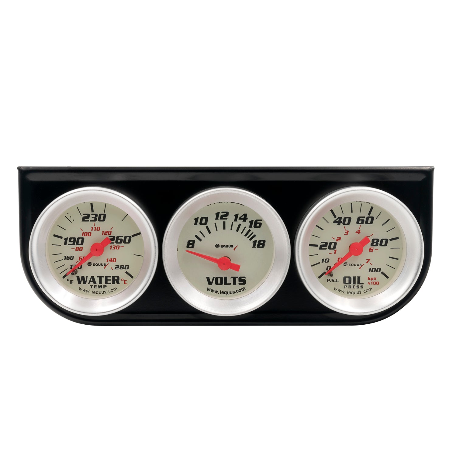 This accurate, durable, and simple to install iEquus 8000 Performance Series triple 1.5 in. mechanical gauge console offers excellent instrumentation value featuring a black mounting panel equipped with backlit, satin silver aluminum bezel, white dial mechanical instruments for Oil Pressure, Battery Voltage, and Water Temperature. Installation hardware included. Additional adapters sold separately.