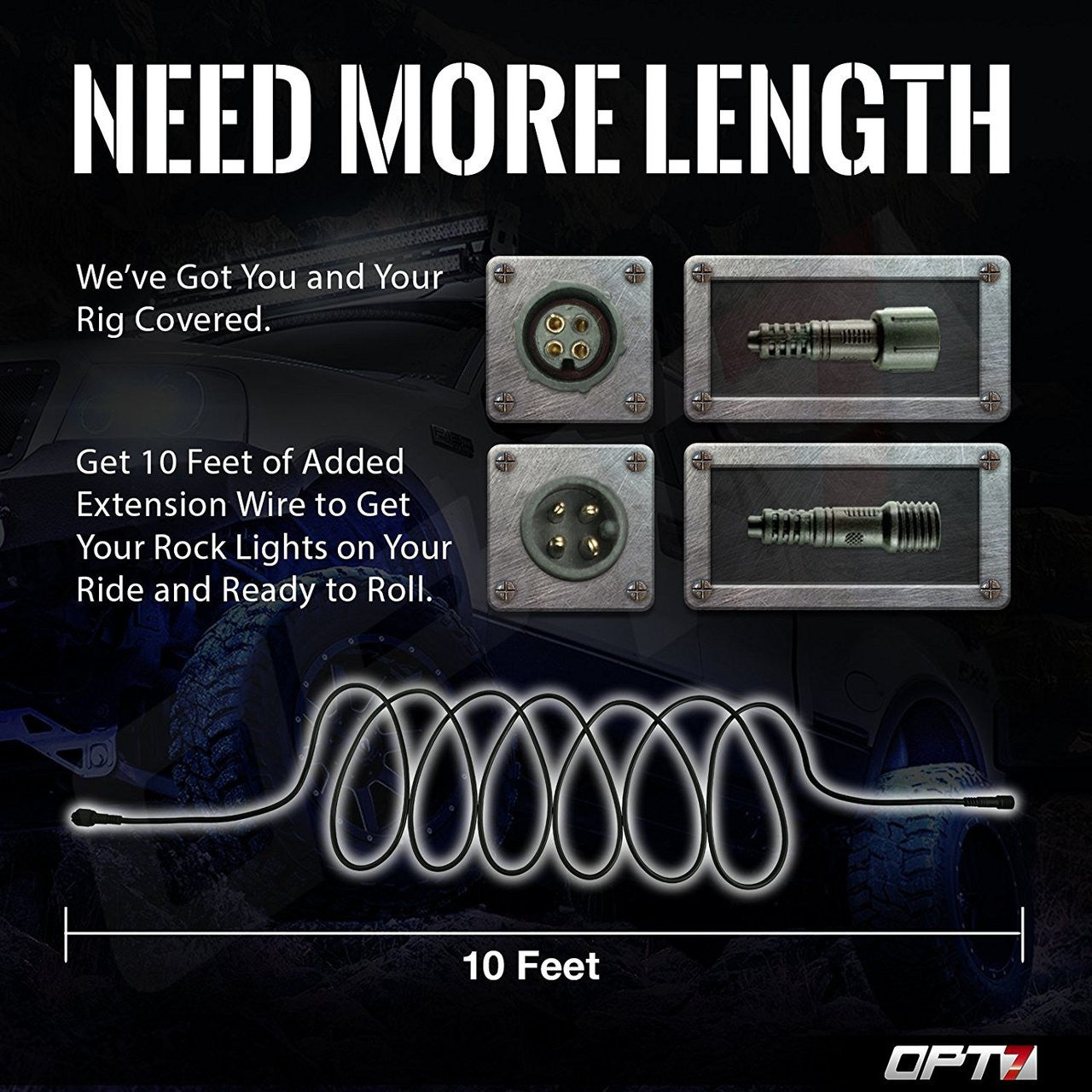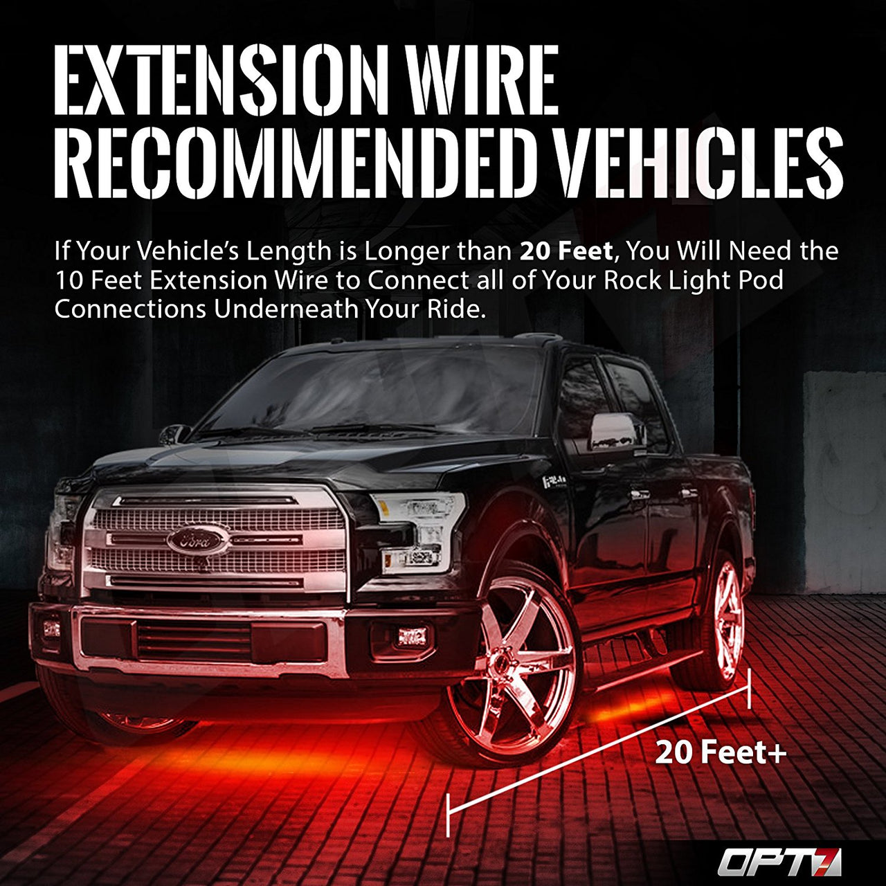 NOTICE: If your vehicle is longer than 20 feet long, You will need extension wire to work with your AURA™ Multi-Color (RGB) Rock Light Kit. Warranty Covered: