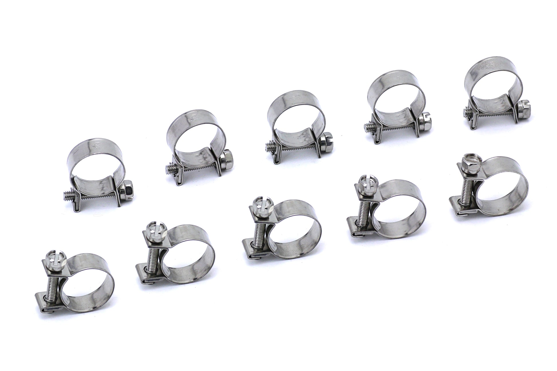 HPS Fuel Injection Hose Clamps are perfect for fuel lines and small diameter hoses. Manufactured with 100% stainless steel, these clamps are designed with durability in mind as they offer better corrosion resistance compared to the standard zinc plated clamps. This product is ideal for industrial, automotive, heavy duty diesel truck, aerospace and marine industries. Smooth inner walls and rolled edges prevent the clamps from cutting into hoses. The bands measure 9mm in width and feature 7mm slotted hex heads for convenient application. Recommended torque 13 in-lbs. SAE size 16, 14mm-16mm (35/64" - 5/8"). Pack of 10 clamps.