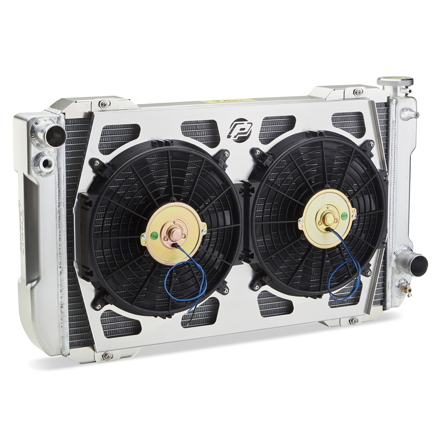 Easy 1-2-3 Series Radiators Systems are just what they sound like! Proform will build the whole system with bracket and fans so it s ready to go right out of the box! This is the best and easiest way to get a high-quality cooling system that doesn t have the DIY look, but rather a sleek show car look. Just thread the thermostat probe into the tank, wire up the adjustable controller, and you ll be driving down the street nice and cool in no time at all. This system includes a LS Conversion single-pass, all-aluminum radiator; low-profile fan bracket; two 12-volt electric fans; and an adjustable thermostat controller.