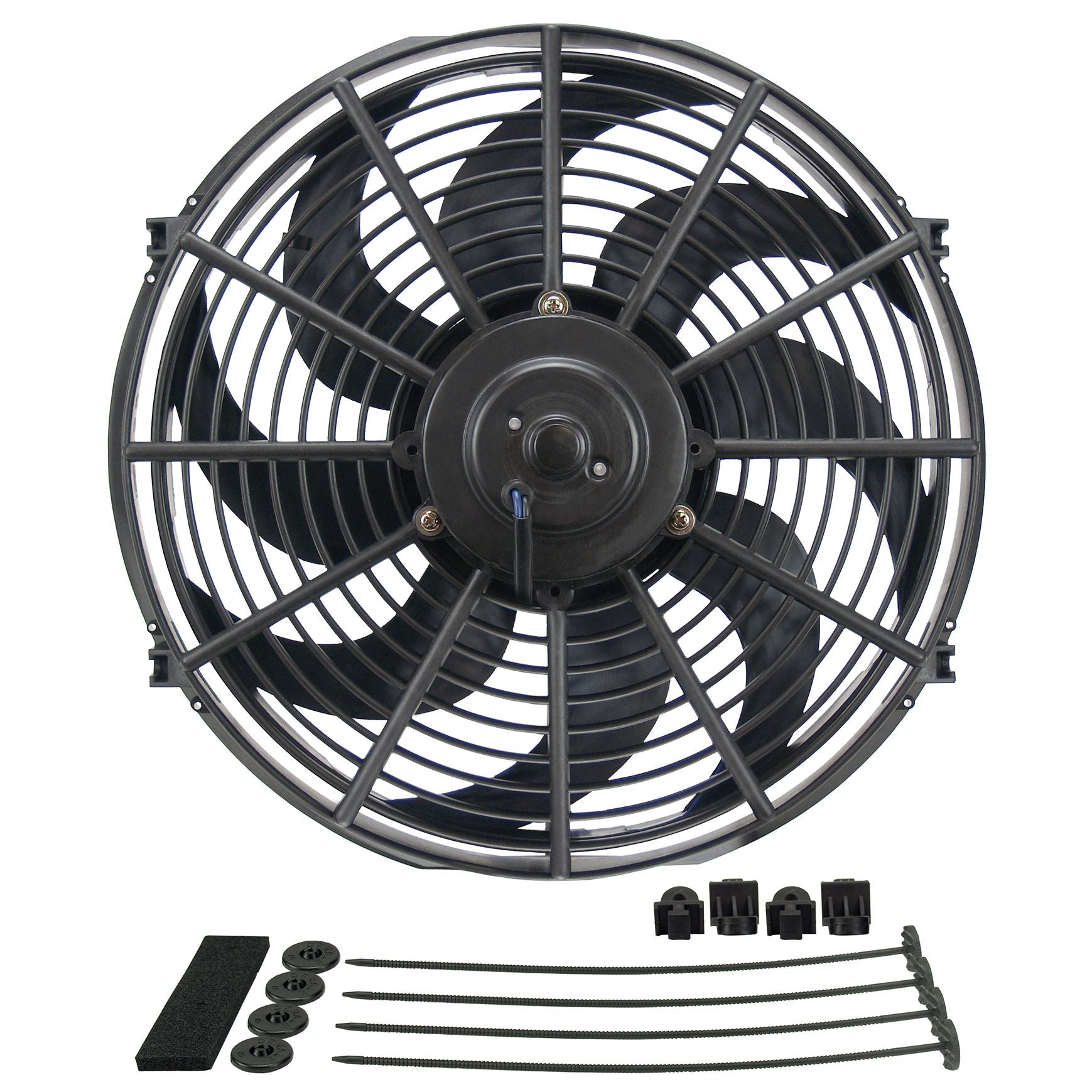 Our 14" Dyno-Cool curved blade electric fan moves 1230 CFM at 0 static pressure while drawing only 9.7 amps. Included with every fan you get a fan mounting kit with 4 plastic through radiator core rods with clips, 4 foam pads and 4 mounting feet.