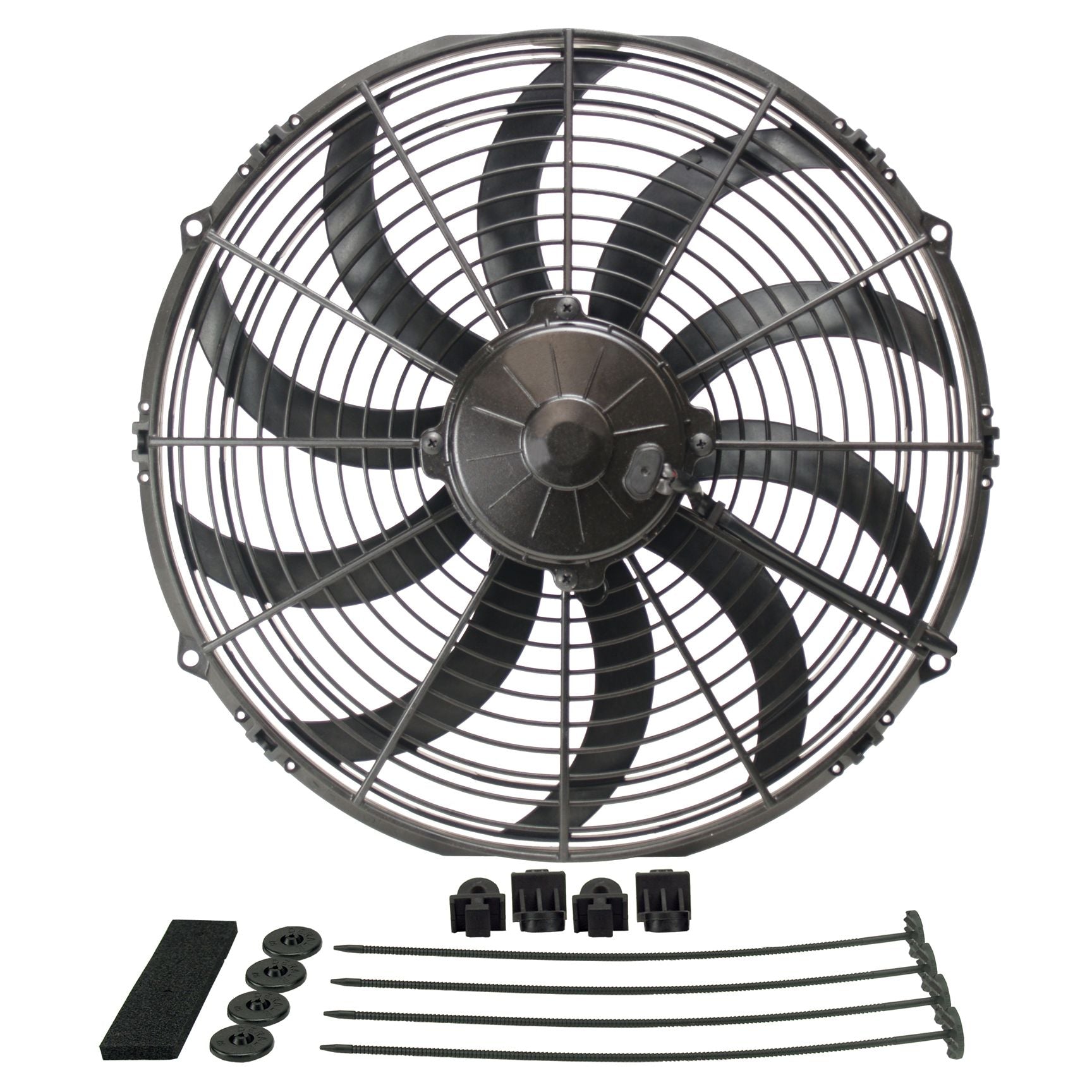 A 14" Diameter version of our high performance H.O. Extreme series of electric fans, this powerful unit uses 10 thin, curved blades to provide a low profile (only 3 7/16" at widest point) for limited space applications. Using a sealed waterproof/dustproof motor that lasts up to 3 times longer than normal electric fan motors, this puller fan is designed to provide maximum performance at high static pressure loads. Mounting kit and installation instructions included.