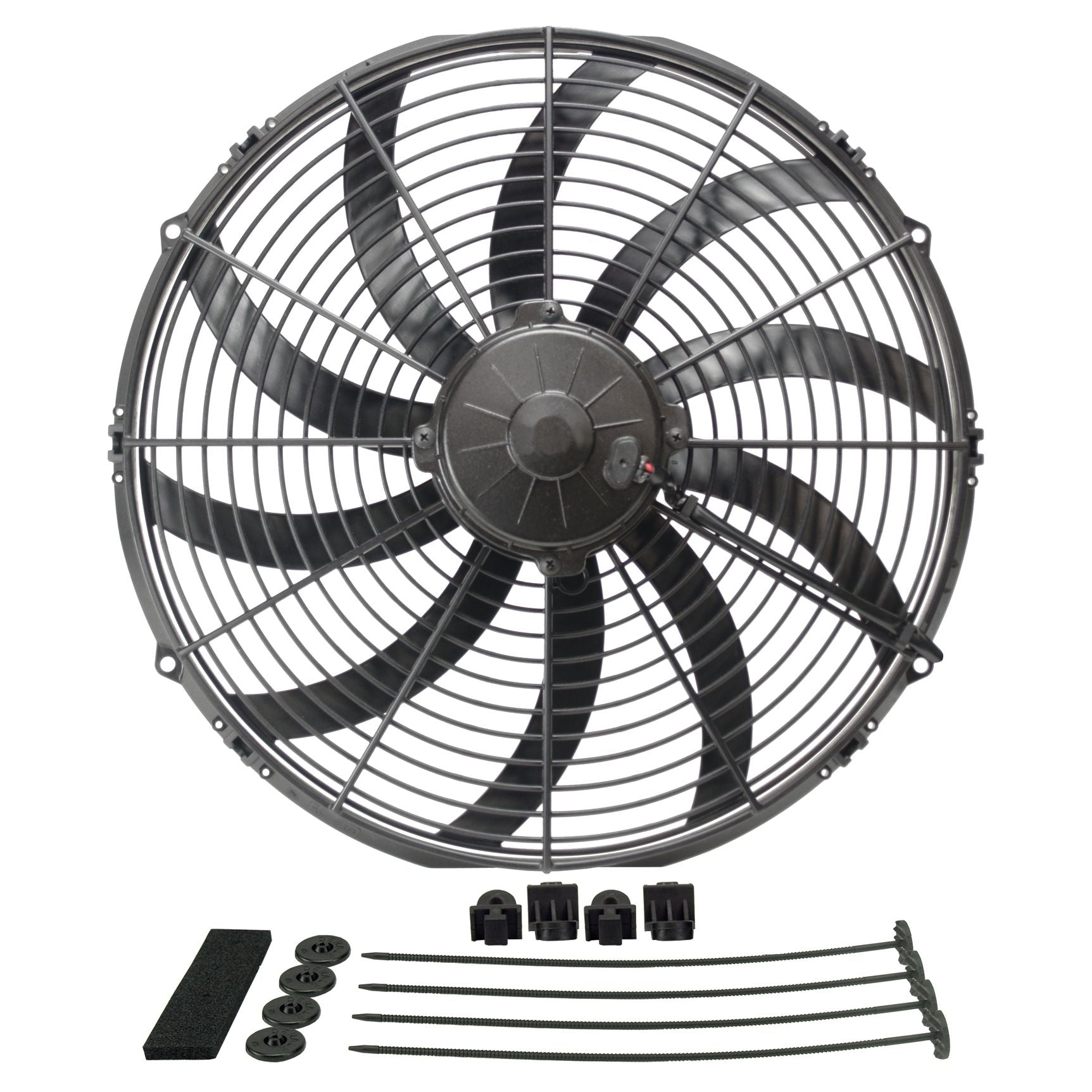 Our largest H.O. Extreme electric fan, this powerful 16" diameter unit uses 10 thin, curved blades to provide a low profile (only 3 7/16" at widest point) for limited space applications. Using a sealed waterproof/dustproof motor that lasts up to 3 times longer than normal electric fan motors, this puller fan is designed to provide maximum performance at high static pressure loads. Mounting kit and installation instructions included.
