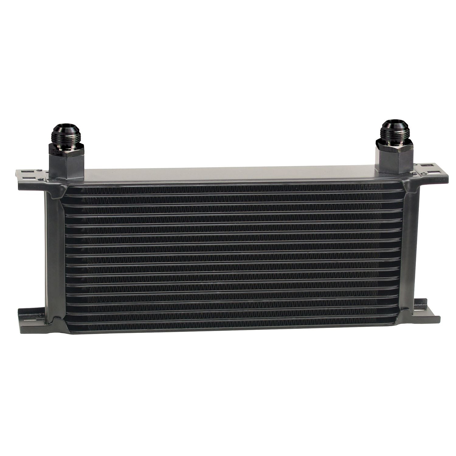Our most efficient heat exchanger, the all aluminum 16 row Stacked Plate cooler features sturdy furnace brazed construction, full 2" deep turbulator-equipped plates and a black powder coat finish. With minimal pressure drop it can be used for engine, transmission or fuel cooling. Includes bright aluminum anodized finished -10AN male adapter fittings.