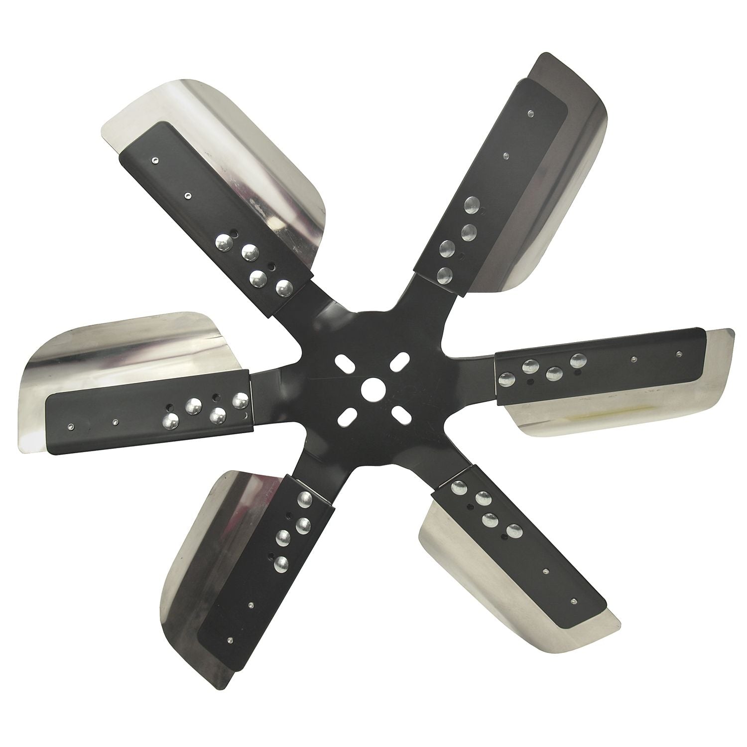 Our 19" heavy duty reverse rotation fan features thick black steel hubs and 6 stainless reinforced blades with a large surface area that improve performance and fuel economy and is rated up to 10,000 rpm. The large surface area of the blades pull more air at lower speeds than other flex fans.