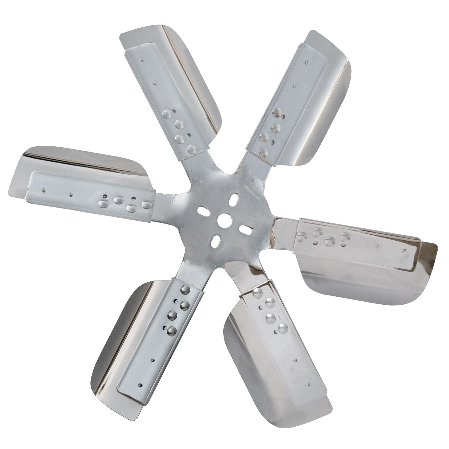 Our 19" heavy duty reverse rotation fan features sturdy chrome plated steel hubs and 6 polished stainless reinforced blades with a large surface area that improve performance and fuel economy and is rated up to 10,000 rpm. The large surface area of the blades pull more air at lower speeds than other flex fans.