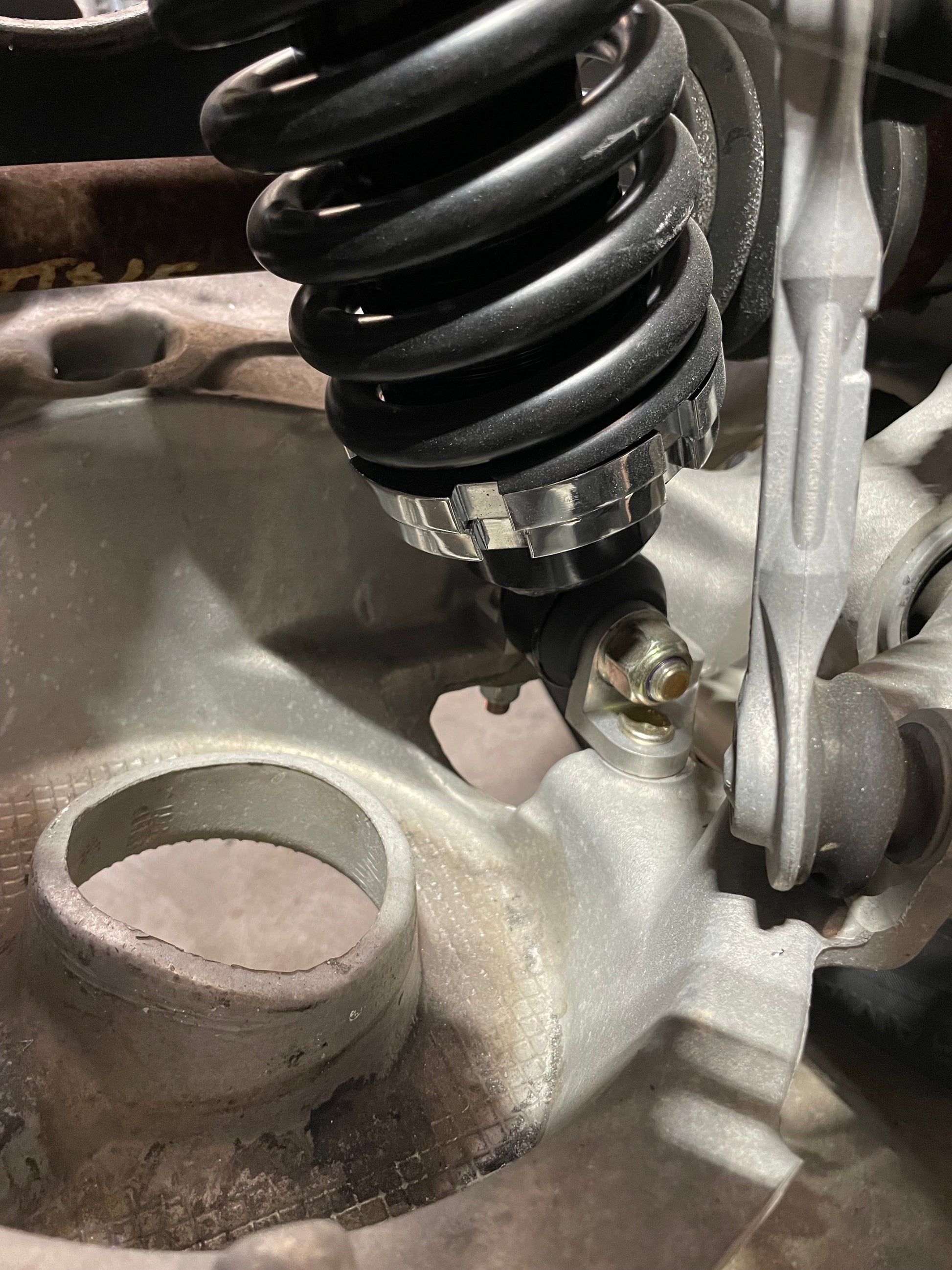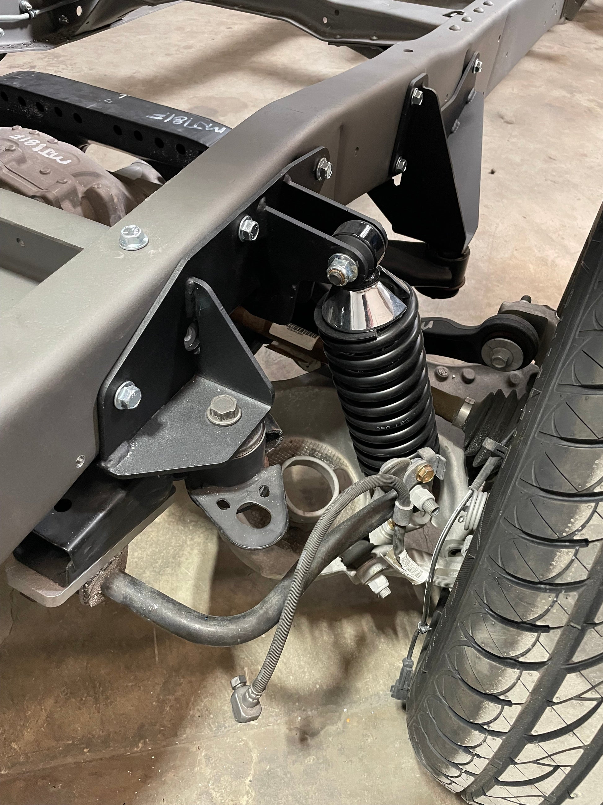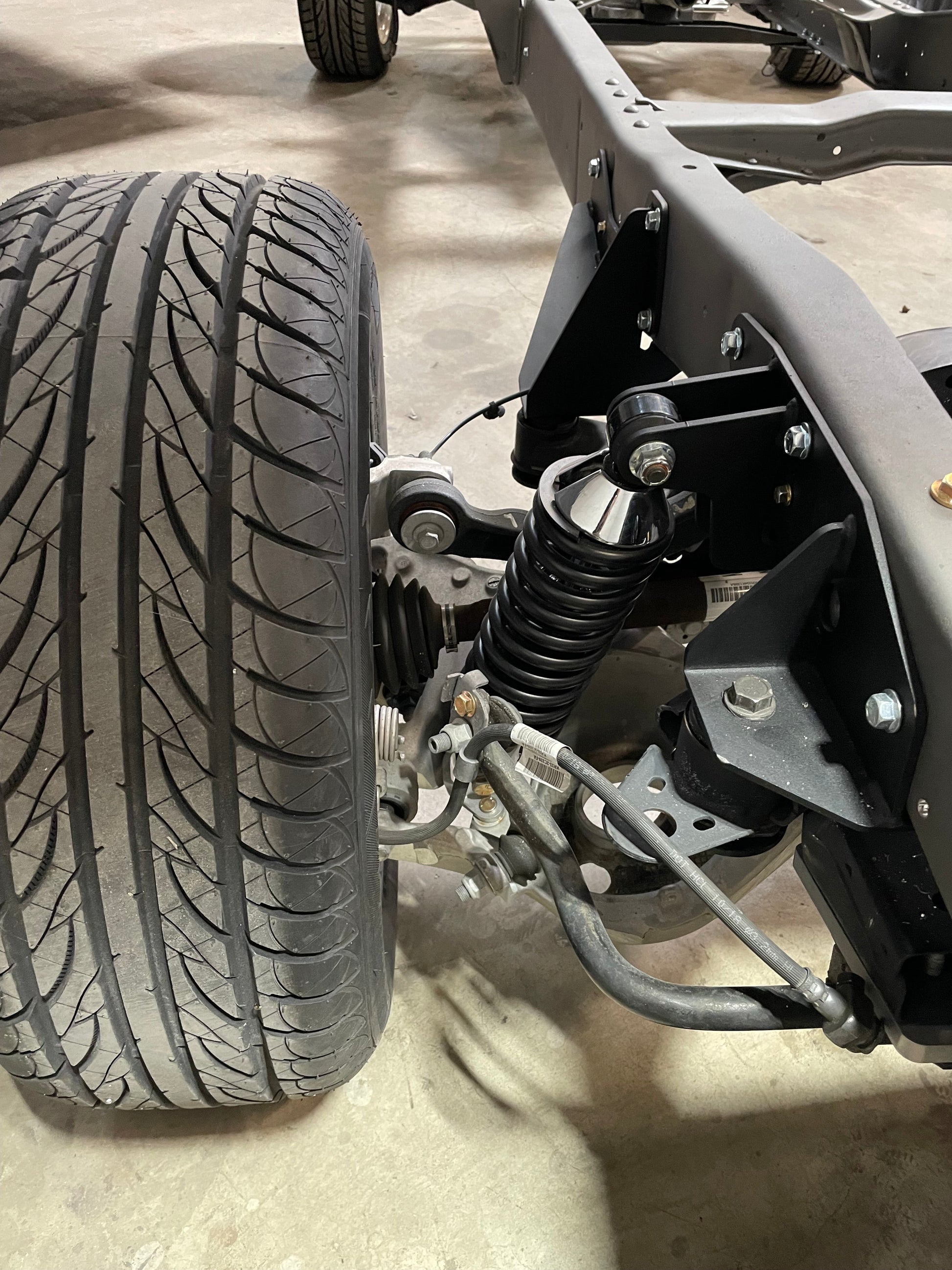 A machined shock adapter is provided for the lower arm to allow a standard coil-over to bolt in place. A bracket is also included to slide the sway bar backwards if needed to clear your coil-over. The kit is designed to fit a 12” coil over (~12” eye to eye at ride height). We recommend a 350-400 lbs./in spring. Please note, coil-overs are not included.