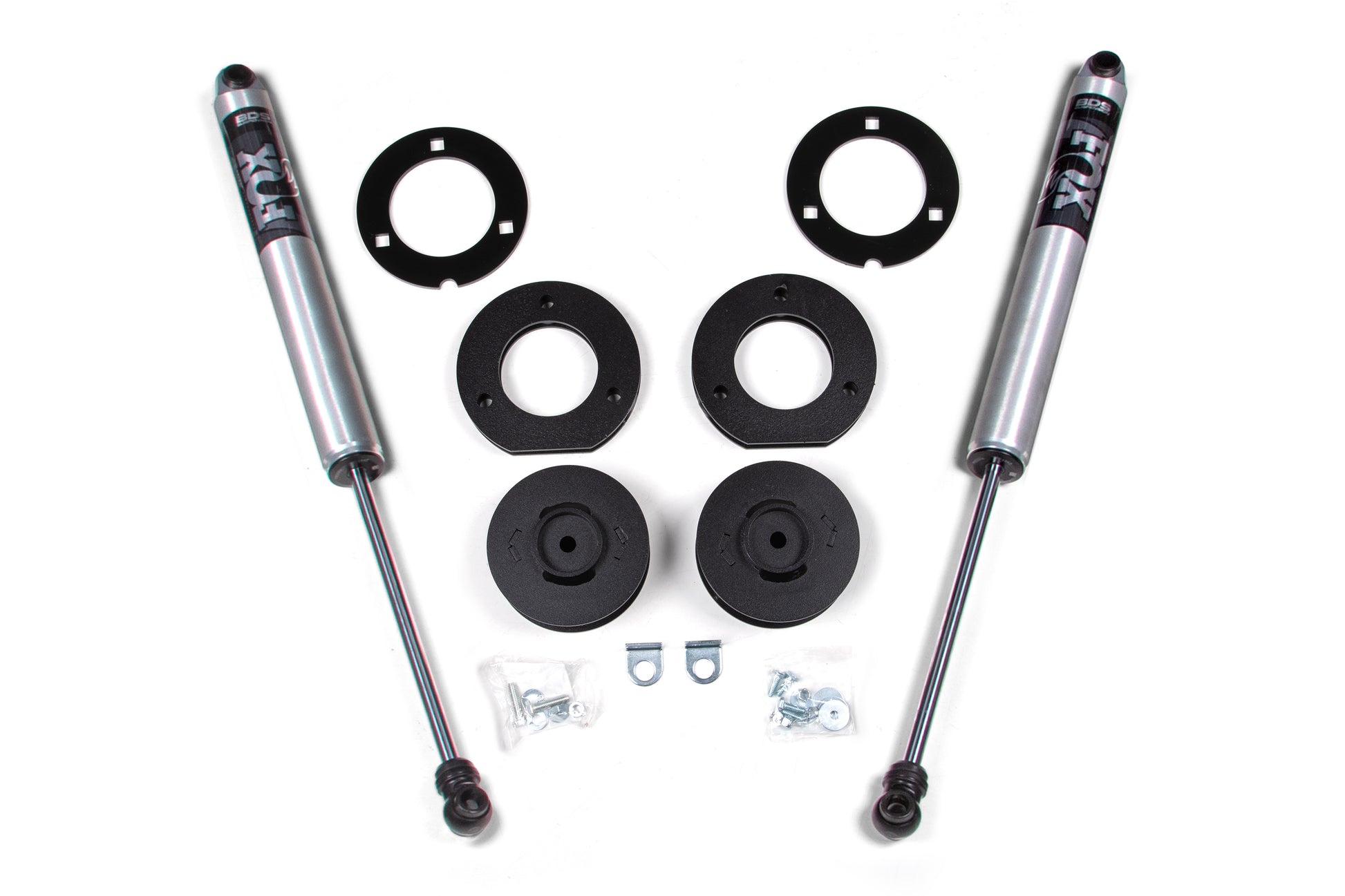 The lift kit includes steel top mount strut spacers pre-load spacer and custom-tuned NX2 Nitro or FOX Performance series shocks. A 2" rear spacer kit is also included to lift the vehicle equally in the front and rear. Give your Chevy 1500 the extra boost with this 2" lift kit from BDS Suspension.