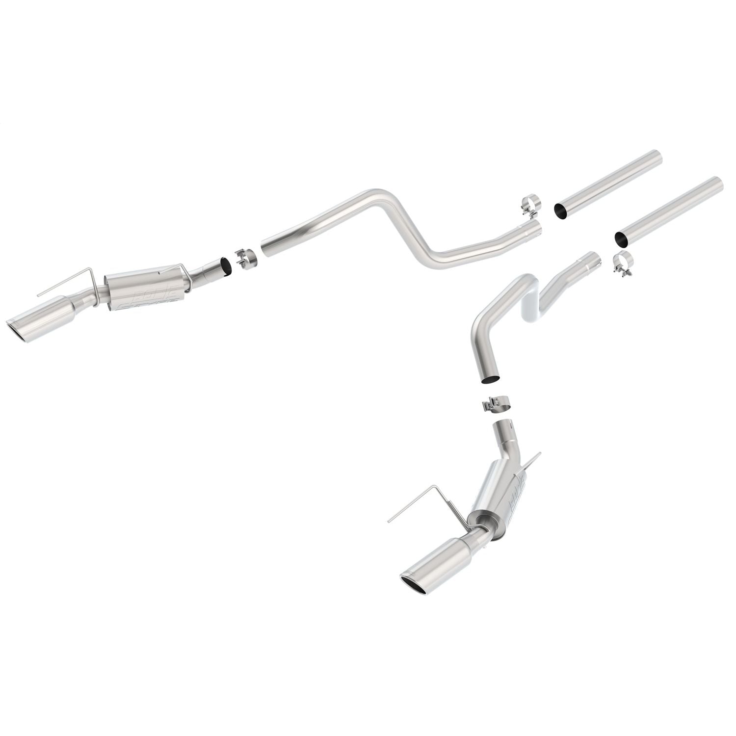 For over 4 decades, Borla Exhaust has been the choice of Mustang experts. Major players in the racing industry and leading tuners from Roush, Steeda, Saleen and Ford Racing to the Shelby 427 Cobra have relied on Borla. This awesome Cat-Back system bolts behind the factory H-pipe, is lighter than the factory system and includes our famous "S-Type" mufflers (PN 140135). X-Pipe (PN 60092) may be added to this system. Borla experience and advance engineering have produced a sexy "S-Type" exhaust with outstanding flow numbers that generate great power enhancements. These attributes, coupled with an aggressive sound of power and awesome big bright chrome on T-304 stainless steel tips, proclaim this Stang is all business. Airflow management and exhaust engineering is a science with which Borla has more experience than anyone in the exhaust aftermarket. The performance matches the famous Borla systems of the past but with a unique muffler and exhaust configuration canceling additional high frequency sound waves. Delivering a significant increase in CFM from the factory system which, as most engine builders will confirm, accounts for the dramatic power improvements. Perhaps more importantly, this added flow maximizes performance for other aftermarket enhancements installed on the Mustang because all Borla exhaust products are tuned for maximum output from any aftermarket performance upgrade. Two Axle-Back system options are also available: an aggressive "S"-Type (PN 11750) and a more mellow Touring (PN 11752) - both replace only the over-the-axle pipes, mufflers and tips. Borla, the original pioneers of premium, high-quality T- 304 austenitic stainless steel (superior to 409 or aluminized steel) free-flow exhaust utilizes patented award and race winning technology to deliver quality, sound, performance gains and enhanced fuel economy - all with an easy bolt-on installation. Best of all, each system come with the unsurpassed Borla Million-Mile Warranty.