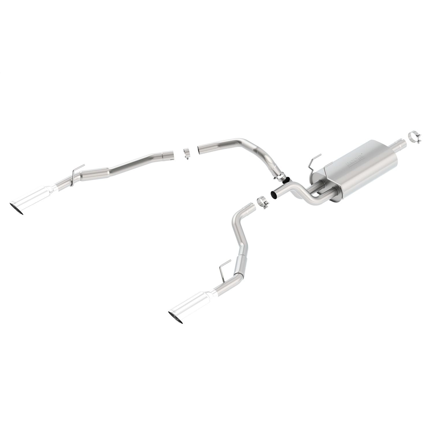 Fits through the factory bumper cut-outs (bumper has notches on the bottom). Features bright chrome on T-304 stainless steel tips. BORLA(r) Cat-Back(tm) and Axle-Back exhaust systems feature patented straight-through and multi-core technology designedto unleash hidden horsepower. Increased exhaust velocity adds power, driving excitement, fuel economy, and the distinctive BORLA(r) Sound of Power respected by motoring enthusiasts everywhere. Each system is built from premium, high-quality austenitic T-304 stainless steel, superior to T-400 series knockoffs (such as 409), to give you the absolute best in performance and durability. Ultra-smooth mandrel bends ensure maximum flow& power, and precision computer numerical control (CNC) manufacturing ensures an accurate fit. Best of all, BORLA(r) stands behind every system with a Million-Mile Warranty. Just what you'd expect from the world's most experienced (and most winning) exhaust brand.