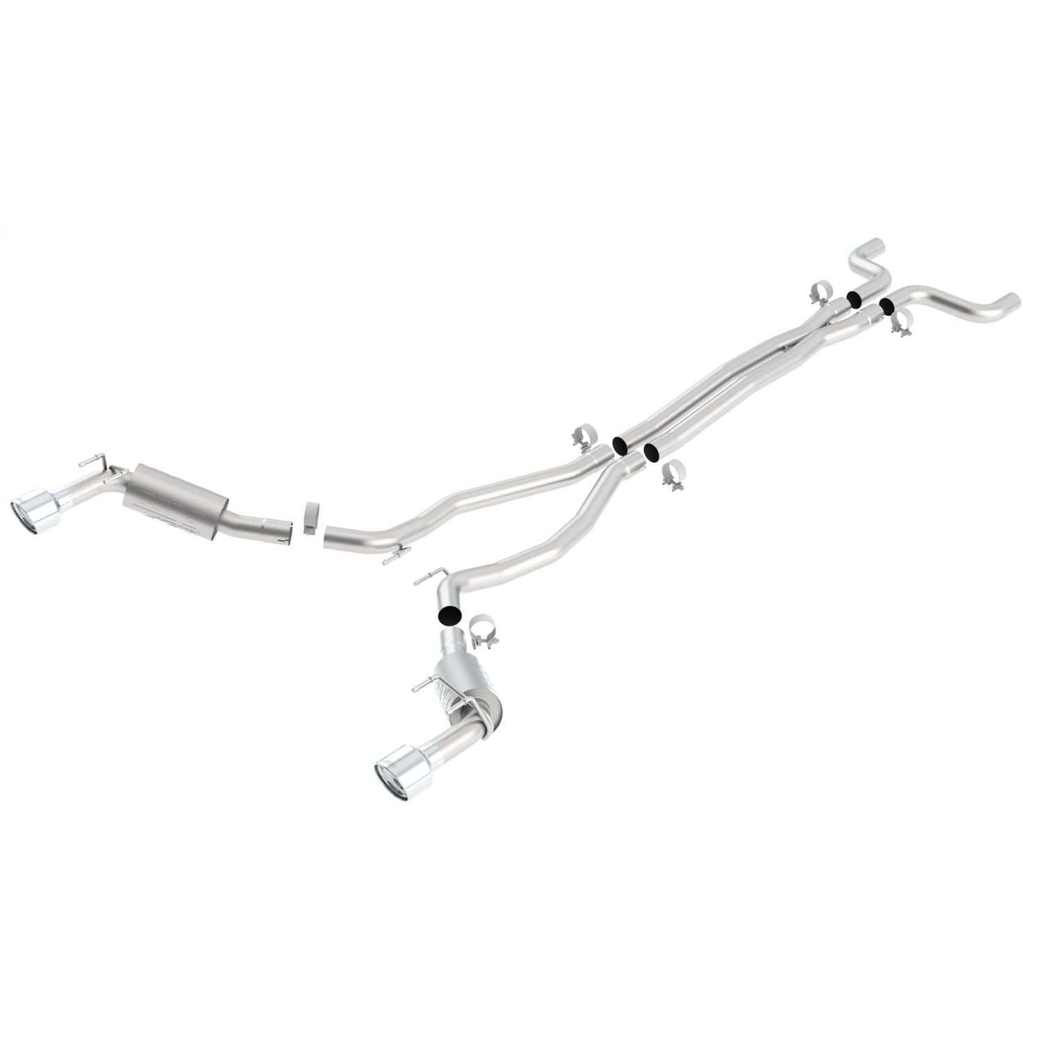 This is BORLA(r)'S complete Cat-Back(tm) system including a merge X-Pipe and ATAK(r) mufflers for improved performance and great sound on the Camaro SS WITHOUT Ground Effects Package (GFX). System features polished T-304 stainless steel tips for a sharp appearance. BORLA(r) has developed a revolutionary exhaust technology that enables our engineers to deliver unprecedented vehicle-specific control over the acoustical note of an exhaust throughout the RPM range, while retaining 100% of the power-adding capabilities of BORLA(r)'s patented multicore design. Called ATAK(r) (Acoustically-Tuned Applied Kinetics), this technology produces the highest available dB (decibel) levels in the BORLA(r) street-legal lineup, and is designed for high-performance purists who prefer exhaust notes over their stereos. The focus of ATAK(r) is to pump the volume while retaining clarity of sound, avoiding distortion typically found in louder exhausts. With ATAK(r), the sound output is tuned like a graphic equalizer to shape and focus sound waves for optimum high-volume output. The development of each ATAK(r) system begins with extensive study of each vehicle's acoustical properties. The technology is based on custom-tuned attributes of the internal muffler cores, which are calibrated on a vehicle-by-vehicle basis to deliver the most desirable sound. A complete technology overview can be viewed at www.youtube.com/borla. Several BORLA(r) ATAK(r) systems are currently available. For the 2010-2013 6.2L V8 Camaro there is a Cat-Back(tm) system and an Axle-Back system for models without the "Ground Effects" option, and a Cat-Back(tm) system and an Axle-Back system designed to complement the Ground Effects kit. Like all BORLA(r) exhaust products, each system is handmade in the USA by master craftspeople and features premium, high-quality T-304 austenitic stainless steel construction, ultra-smooth mandrel bent piping, mirror-polished tips, and a Million-Mile Warranty.