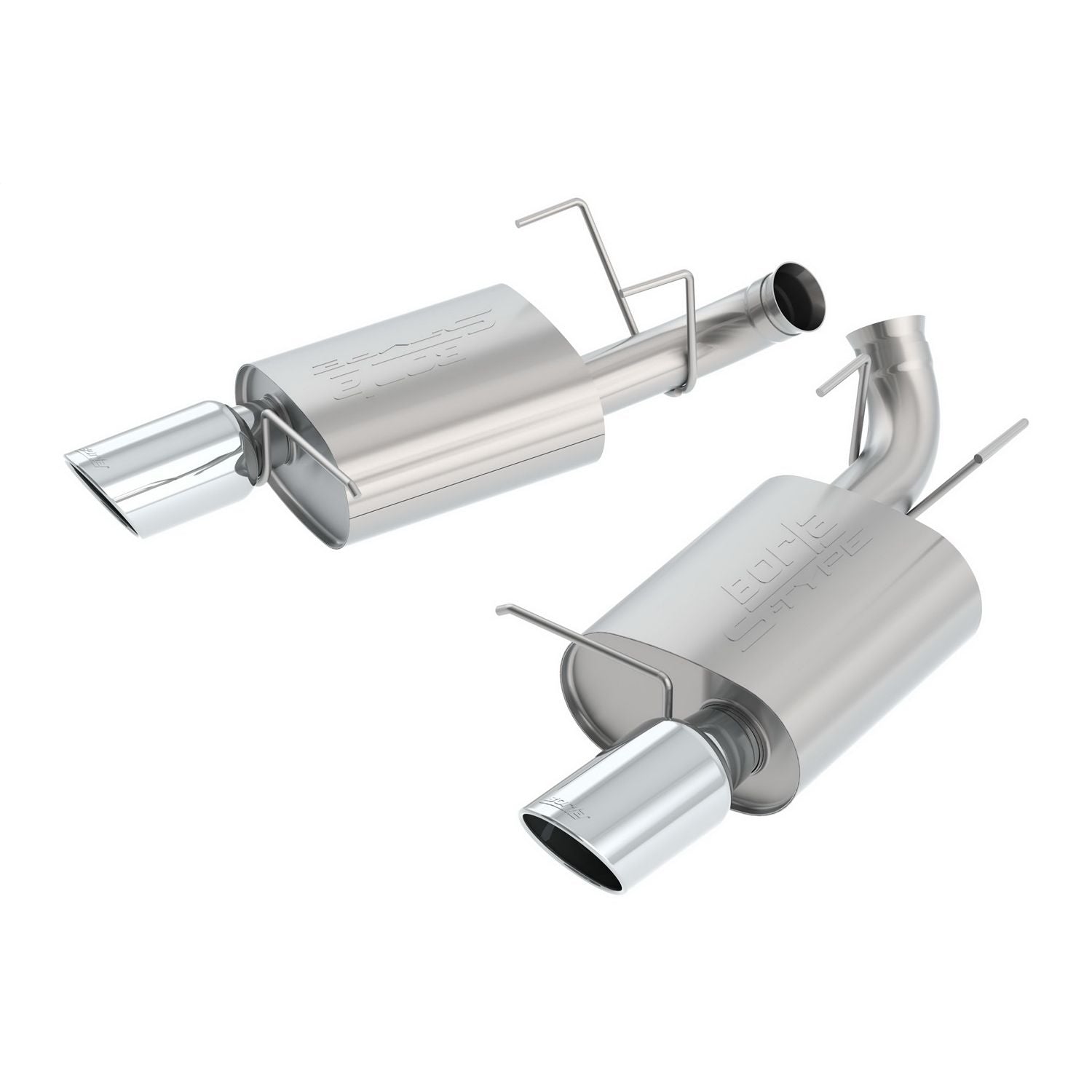 S-Type Axle-Back system. Features bright chrome on T-304 stainless steel tips. Borla Cat-Back & Axle-back exhaust systems feature patented straight-through and multi-core technology designed to unleash hidden horsepower. Increased exhaust velocity adds power, driving excitement, fuel economy, and the distinctive Borla Sound of Power respected by motoring enthusiasts everywhere. Each system is built from premium T-304 stainless steel, superior to T-400 series knockoffs (such as 409), to give you the absolute best in performance and durability. Ultra-smooth mandrel bends ensure maximum flow & power, and precision computer-controlled CNC manufacturing ensures an accurate fit. Best of all, Borla stands behind every system with a Million-Mile Warranty. Just what you?d expect from the world?s most experienced (and most winning) exhaust brand.