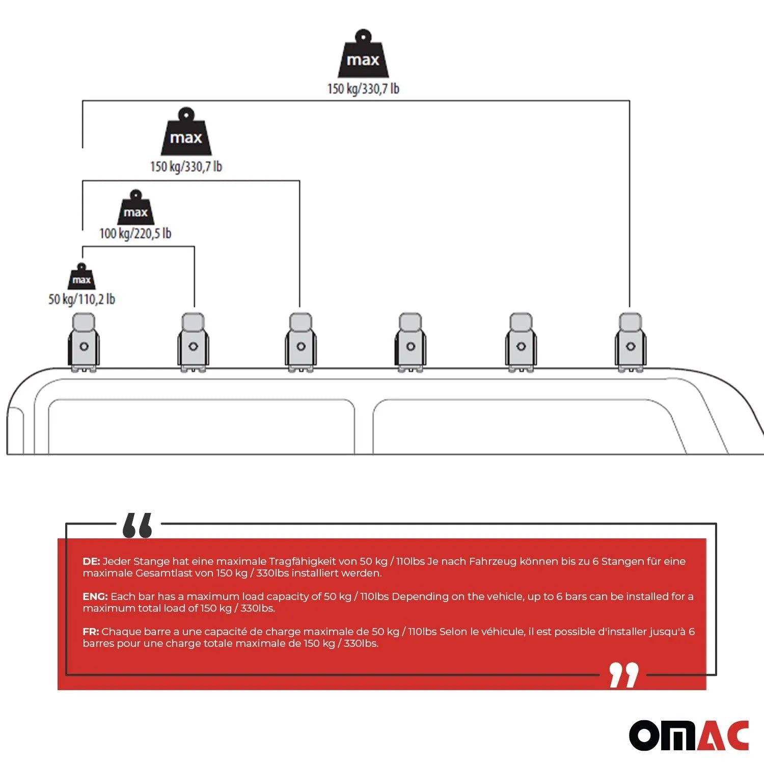 OMAC high-quality aluminum roof racks with European design & style. Its aerodynamic design and easy installation make it a perfect fit for your vehicle. This removable and lightweight rack is ultra durable, waterproof, and wind resistant. With low noise, it accommodates bike and ski carriers. It's also compatible with roof cargo boxes, luggage, and kayak carriers. Experience the versatility of our multifunctional cross bars for all your travel needs.