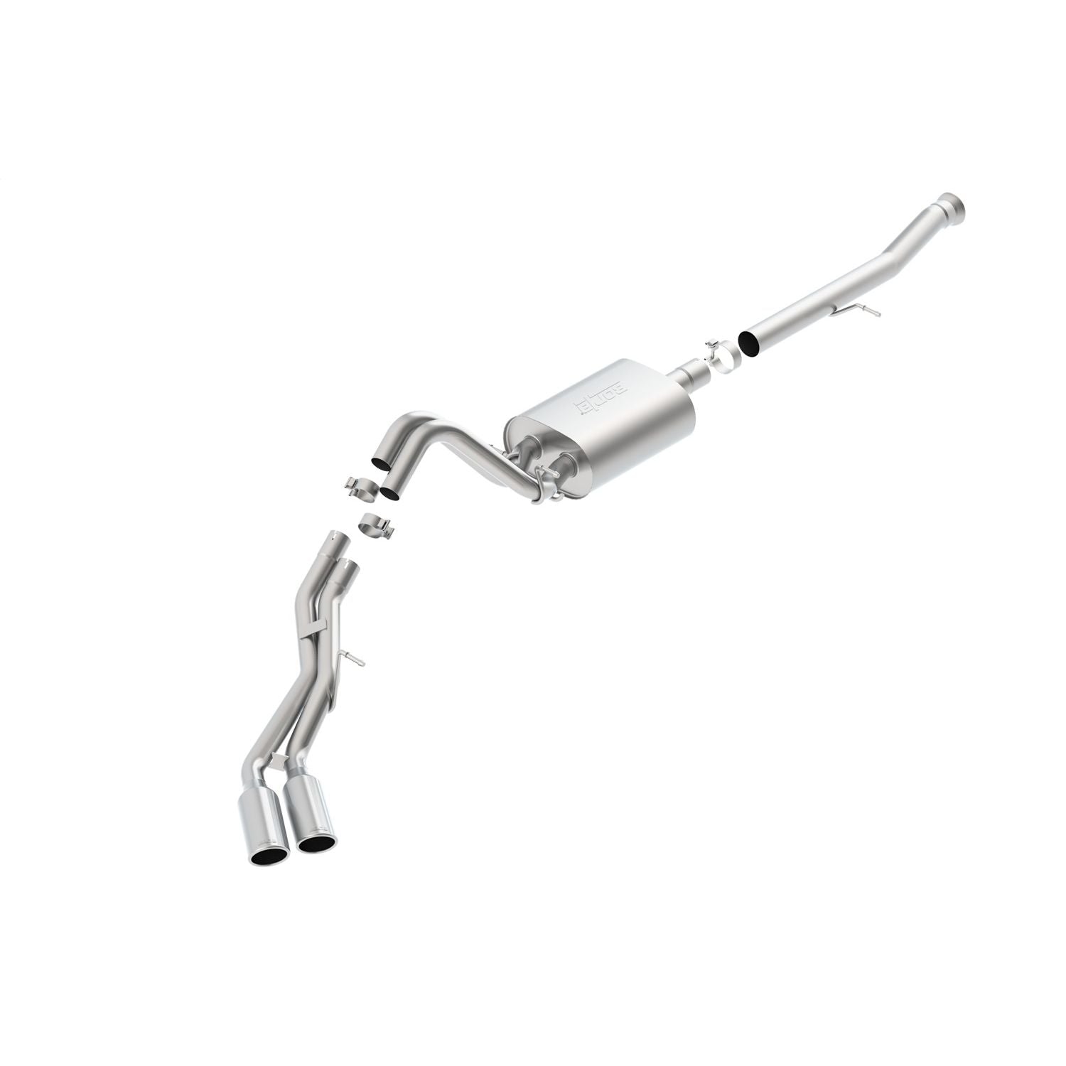 This system features bright chrome on T-304 stainless steel tips. Borla Cat-Back & Axle-Back exhaust systems feature patented straight-through and multi-core technology designed to unleash hidden horsepower. Increased exhaust velocity adds power, driving excitement, fuel economy, and the distinctive Borla Sound of Power respected by motoring enthusiasts everywhere. Each system is built from premium T-304 stainless steel, superior to T-400 series knockoffs (such as 409), to give you the absolute best in performance and durability. Ultra-smooth mandrel bends ensure maximum flow & power, and precision computer-controlled CNC manufacturing ensures an accurate fit. Best of all, Borla stands behind every system with a Million-Mile Warranty. Just what you?d expect from the world?s most experienced (and most winning) exhaust brand.