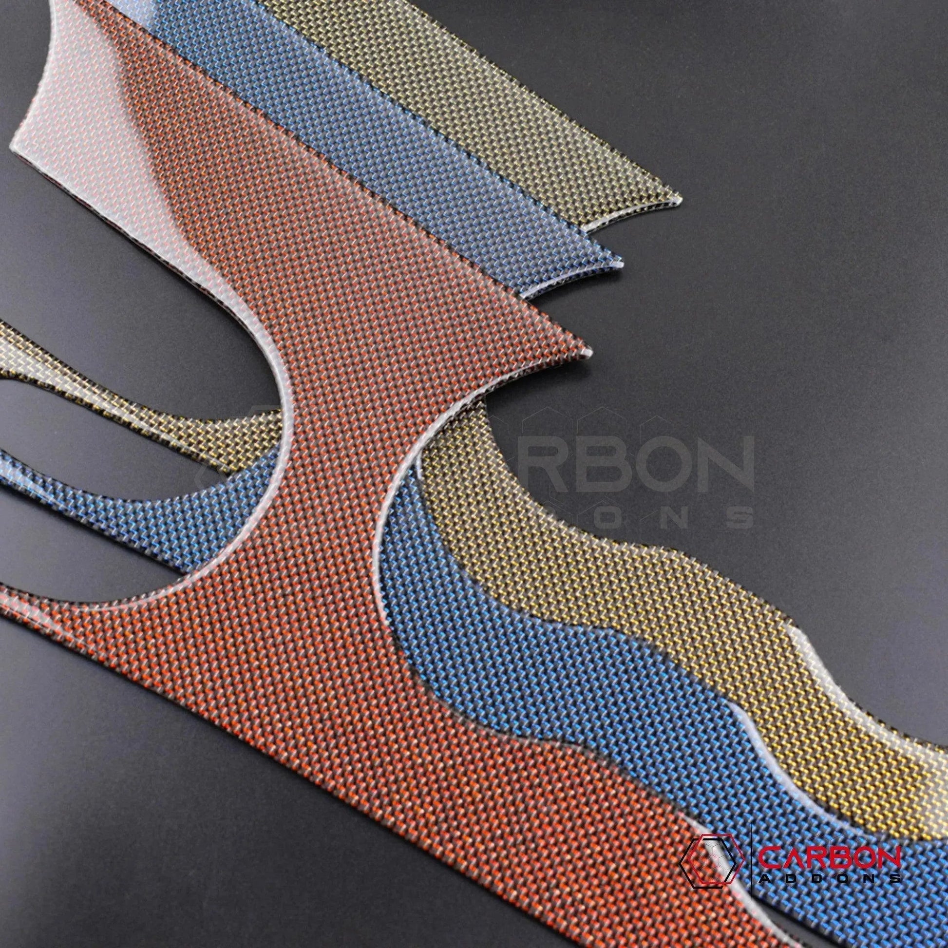 This carbon fiber interior overlay is made using real carbon fiber woven in a 2x2 twill weave with an added metallic thread that reflects it's color for an added accent to the already beautiful carbon fiber strands. If you do not want the added metallic thread, you can find our standard carbon fiber version on another listing. It is designed to upgrade the look of your Mustang's interior. It is not a replacement part, this is a carbon fiber overlay that goes directly on your Center Console Trim and is installed via included adhesive which means no professional installation is required.