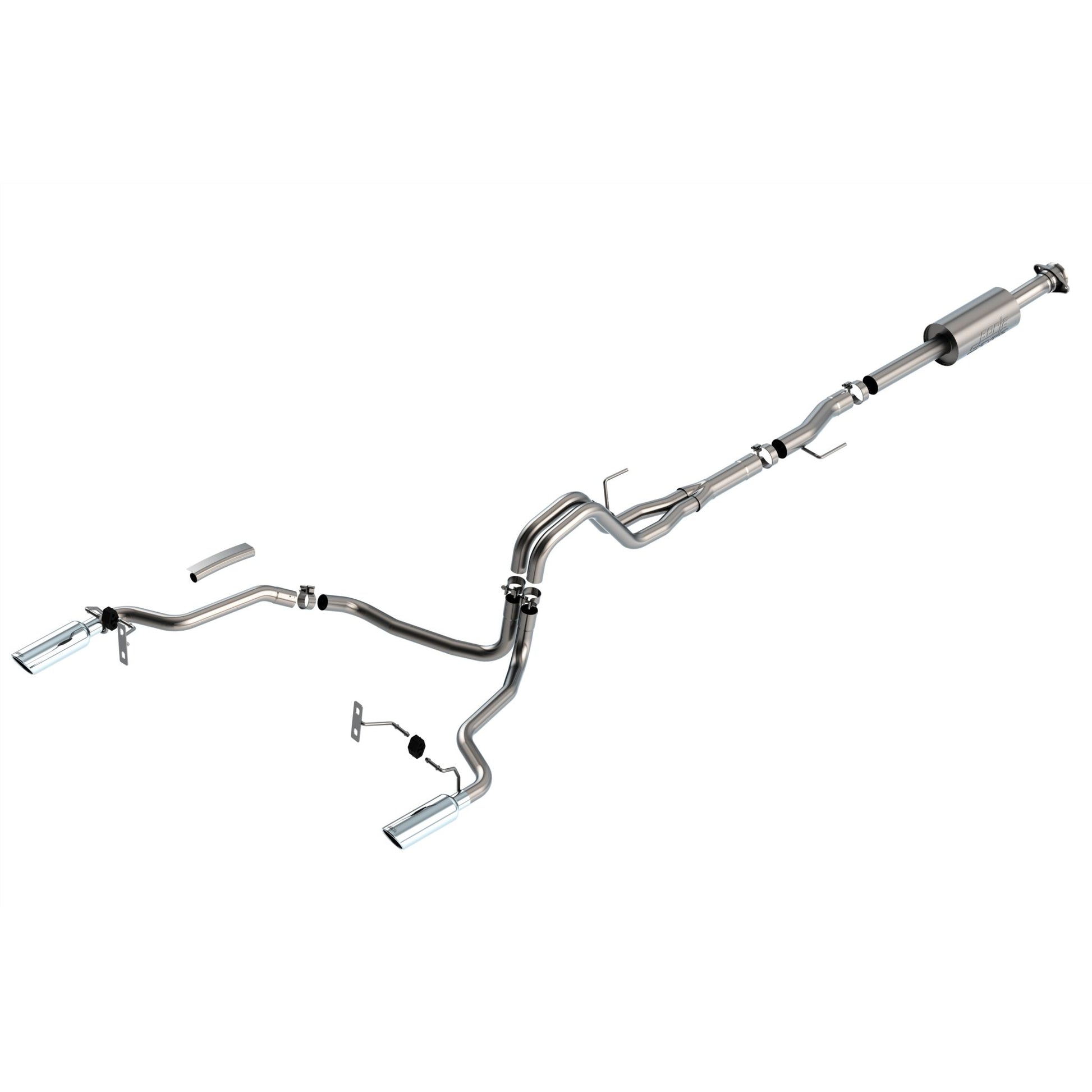 The BORLA(r) Cat-Back(tm) system 140863 was specifically designed to enhance the power and sound of the Ford F-150 equipped with 2.7L and 3.5L Engines. EXCEPT 3.5L PowerBoost and Tremor models. It includes bright chromed T-304 stainless steel tips and a split rear exit configuration. The entire system is made of T-304 stainless steel and utilizes computer numerical control (CNC) manufacturing techniques that ensure an accurate fit. This system features the "S-Type" sound that gives you an aggressive sound with no drone. It is also available with black chromed tips (part number 140863BC). There are additional systems available for the 2.7L and 3.5L F-150 that offer different options for sound level, tip finish and tip Exits. Add Adapter 60556 for Crew Cab with Standard Bed (157.2") Wheelbase vehicles. Add Adapter 60564 for Extended Cab with Long Bed (164.1") Wheelbase vehicles. All this is backed by our unsurpassed Million Mile Warranty., System Features:, Cat-Back(tm) System, Split Rear Exit, Bright Chrome On T-304 Stainless Steel Tips, S-Type Sound Level, T-304 Stainless Steel Construction, Bolt-On Installation, Million Mile Warranty