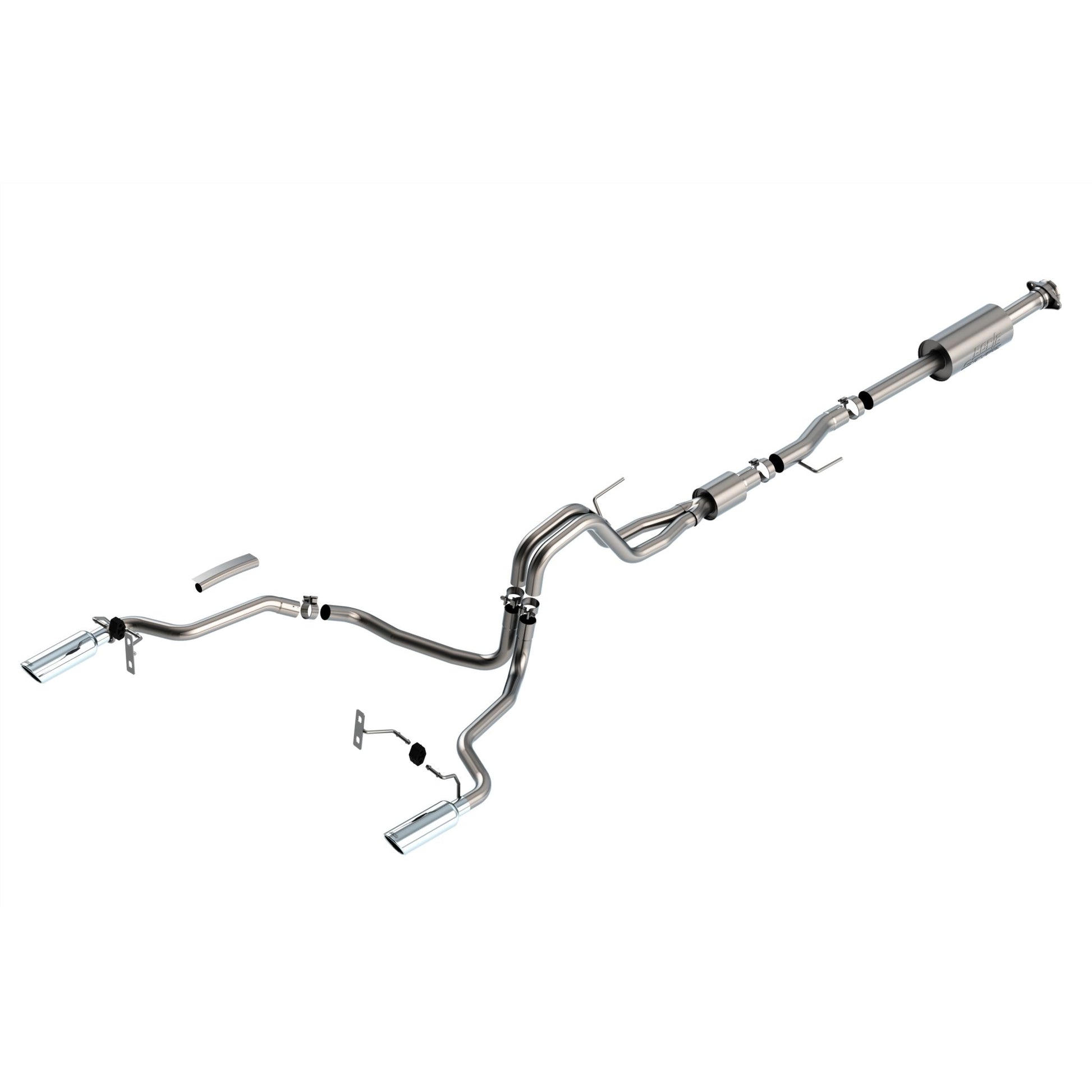 The Borla(r) Cat-Back(tm) system 140866 was specifically designed to enhance the power and sound of the Ford F-150 equipped with the 5.0L V8 engine. It includes bright chromed T-304 stainless steel tips and a split rear exit configuration. The entire system is made of T-304 stainless steel and utilizes computer numerical control (CNC) manufacturing techniques that ensure an accurate fit. This system features the "S-Type" sound that gives you an aggressive sound with no drone. It is also available with black chromed tips (part number 140866BC). There are additional systems available for the 5.0L F-150 that offer different options for sound level, tip finish and tip exits. Add adapter 60556 for Crew Cab Standard Bed (157.2") Wheelbase Vehicles Add adapter 60564 for Extended Cab Long Bed (164.1") wheelbase vehicles. All this is backed by our unsurpassed Million Mile Warranty., System Features:, Cat-Back(tm) System, Split Rear Exit, Bright Chrome On T-304 Stainless Steel Tips, S-Type Sound Level, T-304 Stainless Steel Construction, Bolt-On Installation, Million Mile Warranty