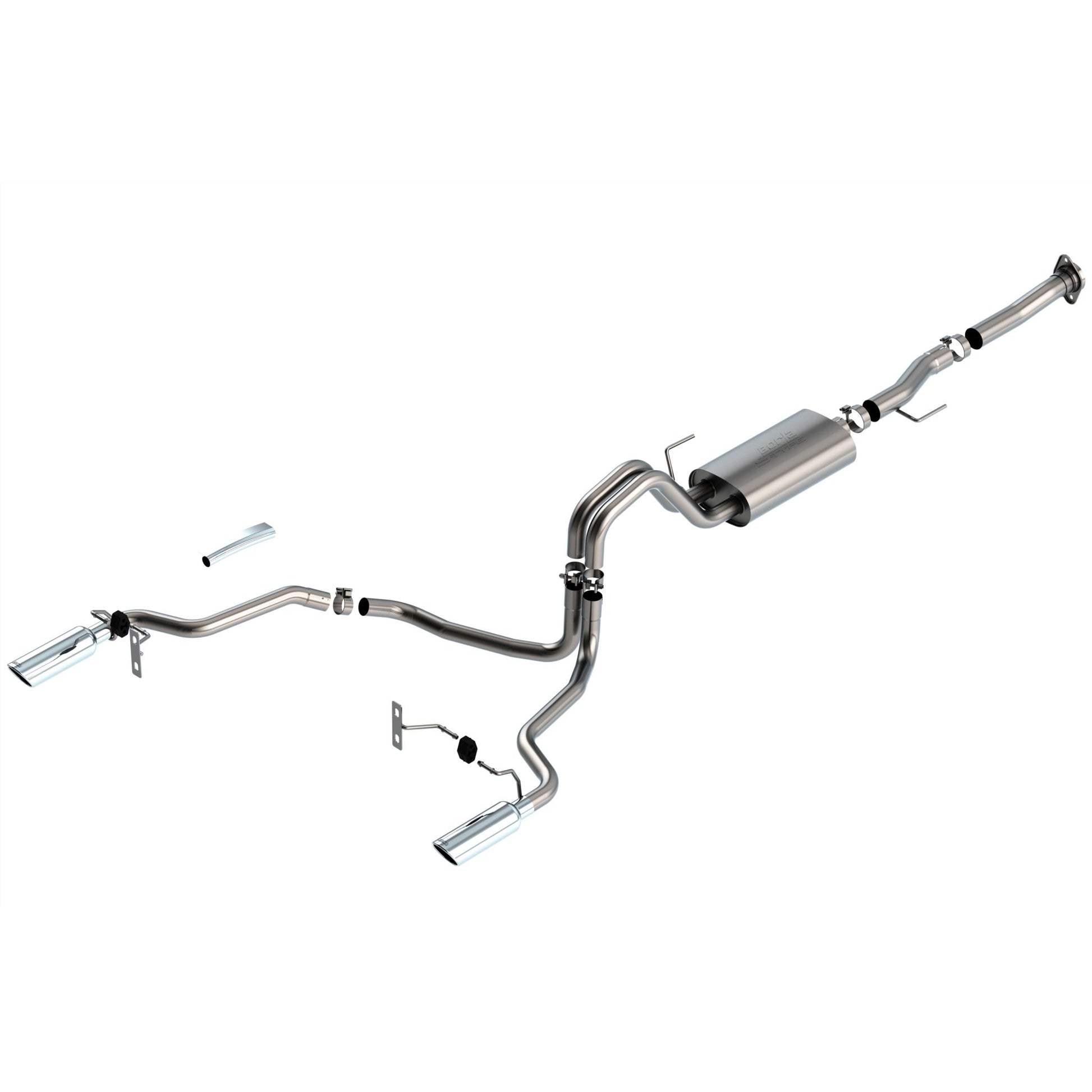 The Borla(r) Cat-Back(tm) system 140868 was specifically designed to enhance the power and sound of the Ford F-150 equipped with the 5.0L V8 engine. It includes bright chromed T-304 stainless steel tips and a split rear exit configuration. The entire system is made of T-304 stainless steel and utilizes computer numerical control (CNC) manufacturing techniques that ensure an accurate fit. This system features the "S-Type" sound that gives you a mild sound of power with no drone. It is also available with black chromed tips (part number 140868BC). There are additional systems available for the 5.0L F-150 that offer different options for sound level, tip finish and tip Exits. Add adapter 60564 for Regular Cab Long Bed (141.5") wheelbase vehicles. All this is backed by our unsurpassed Million Mile Warranty., System Features:, Cat-Back(tm) System, Split Rear Exit, Bright Chrome On T-304 Stainless Steel Tips, S-Type Sound Level, T-304 Stainless Steel Construction, Bolt-On Installation, Million Mile Warranty