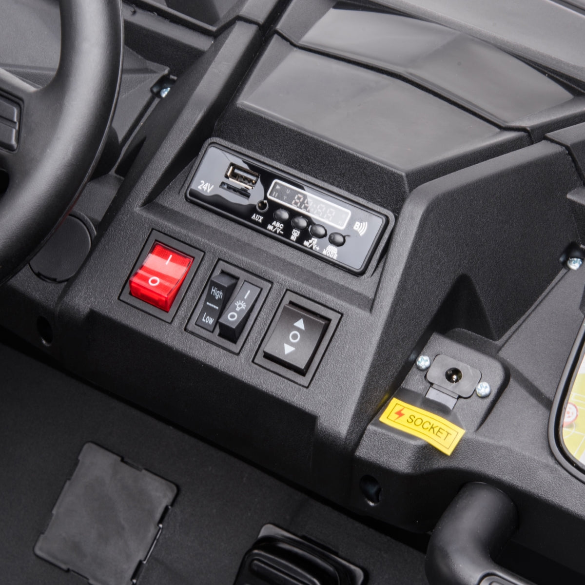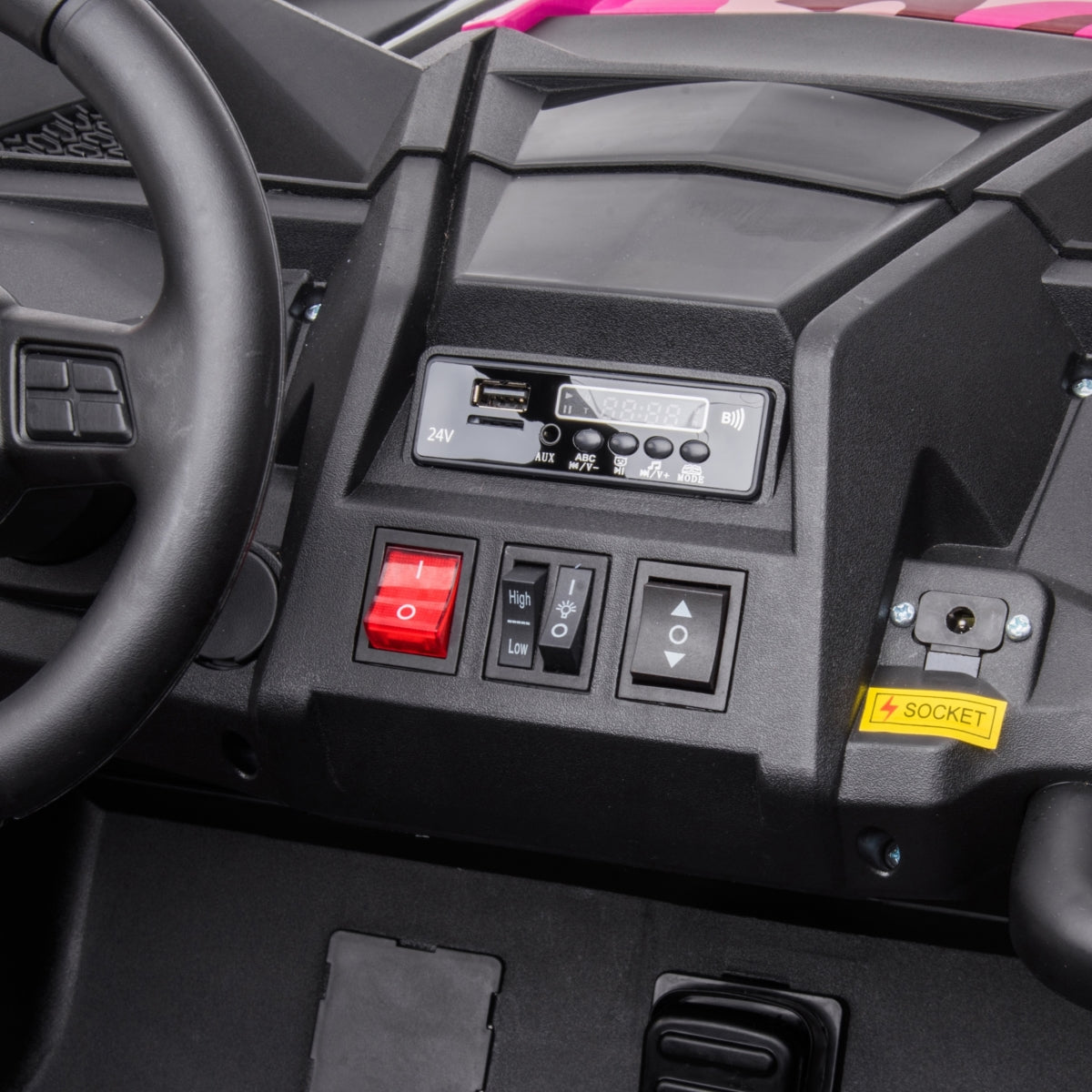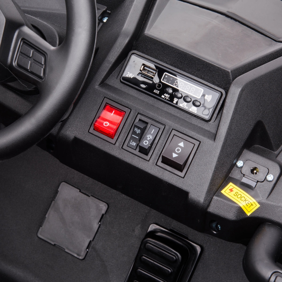 This model is the star of the desert without any doubt! Its 24V battery is capable of supporting two children up to 132lbs and it can move on any type of terrain without any problem thanks to its EVA tires and suspensions. It also has seat belts and a remote control for the parents so they can be at ease at all times, and also has two seats. Your child will be able to share great adventures with his best travel companion while listening to his favorite music thanks to the mp3 player. The driving experience has never been so much fun!