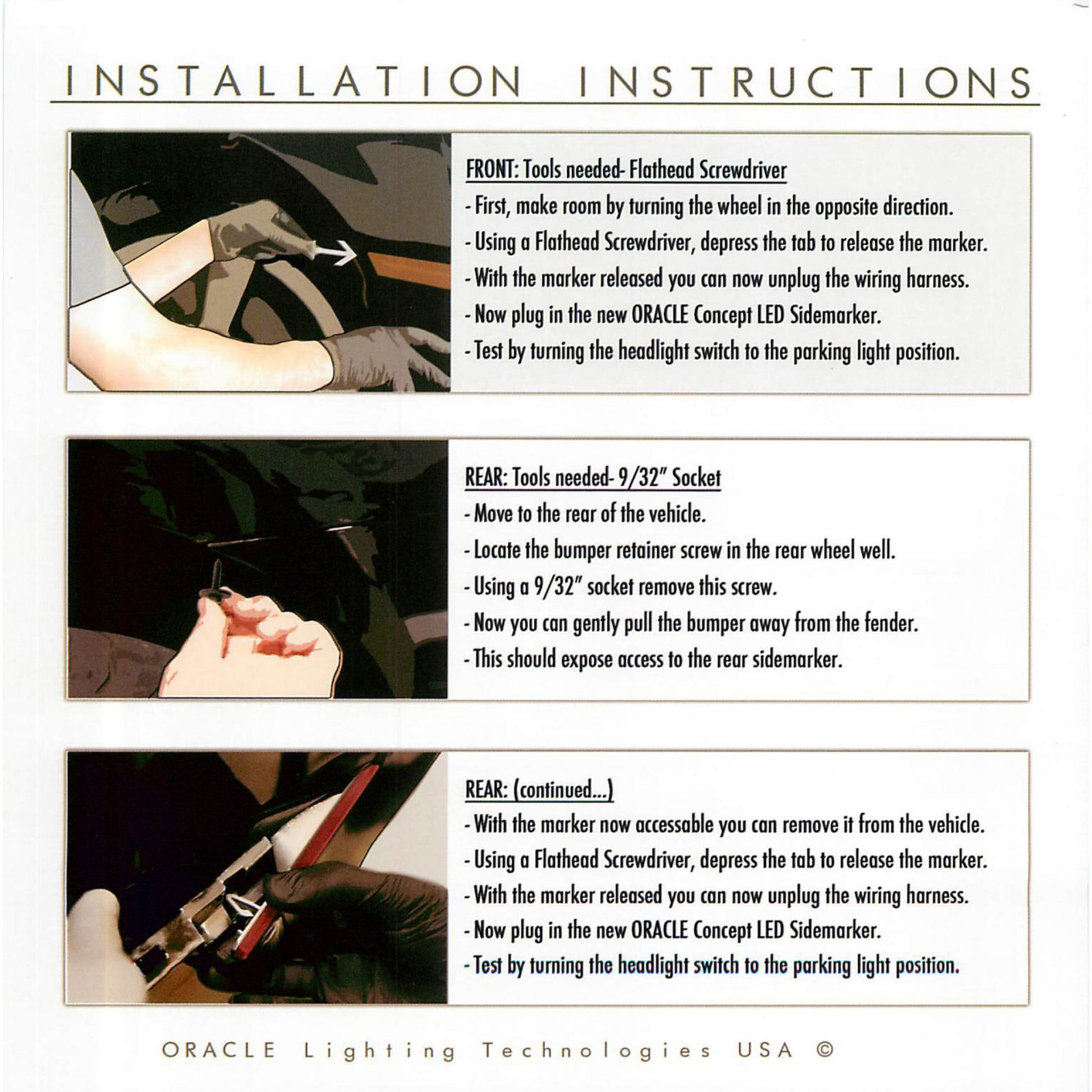 Concept SMD Sidemarker lights are complete sidemarker replacements fitted with high powered 3528 Bridgelux LEDs that produce a laser-like appearance. These are available with Clear or Tinted lenses and painted to match any of the factory paint codes. Note Order can take from 2-4 weeks processing time as they are custom-painted-to-order. Disclaimer: ORACLE Lighting offers these parts professionally painted to order. We strongly recommend using this painting service when ordering these parts. If you choose to paint these products yourself please note that parts not properly painted with a UV clearcoat will not be covered under warranty. The clearcoat protects the acrylic parts from harmful UV damage and fills any pinholes preventing moisture issues.