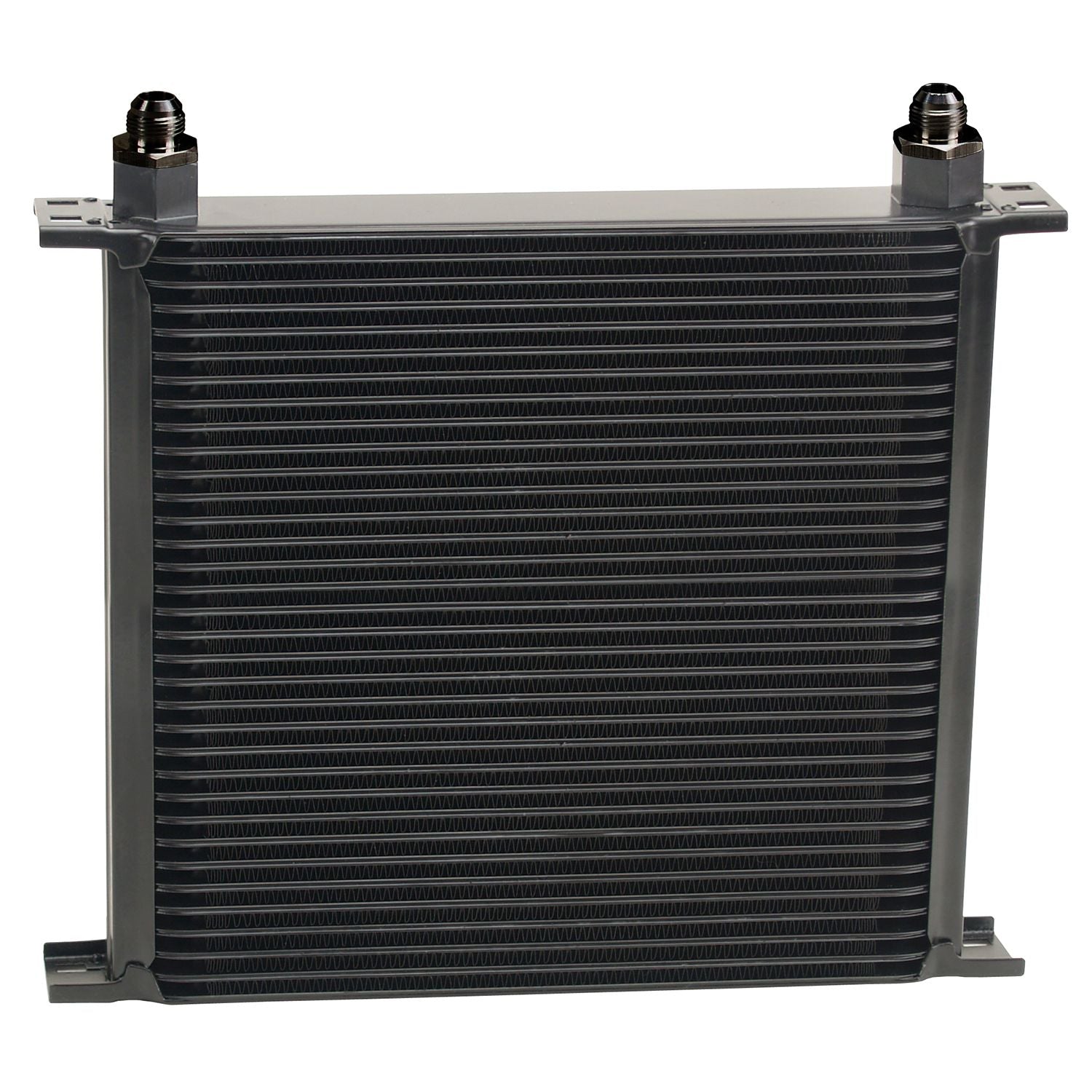 Our most efficient heat exchanger, the all aluminum 34 row Stacked Plate cooler features sturdy furnace brazed construction, full 2" deep turbulator-equipped plates and a black powder coat finish. With minimal pressure drop it can be used for engine, transmission or fuel cooling. Includes bright aluminum anodized finished -8AN male adapter fittings.