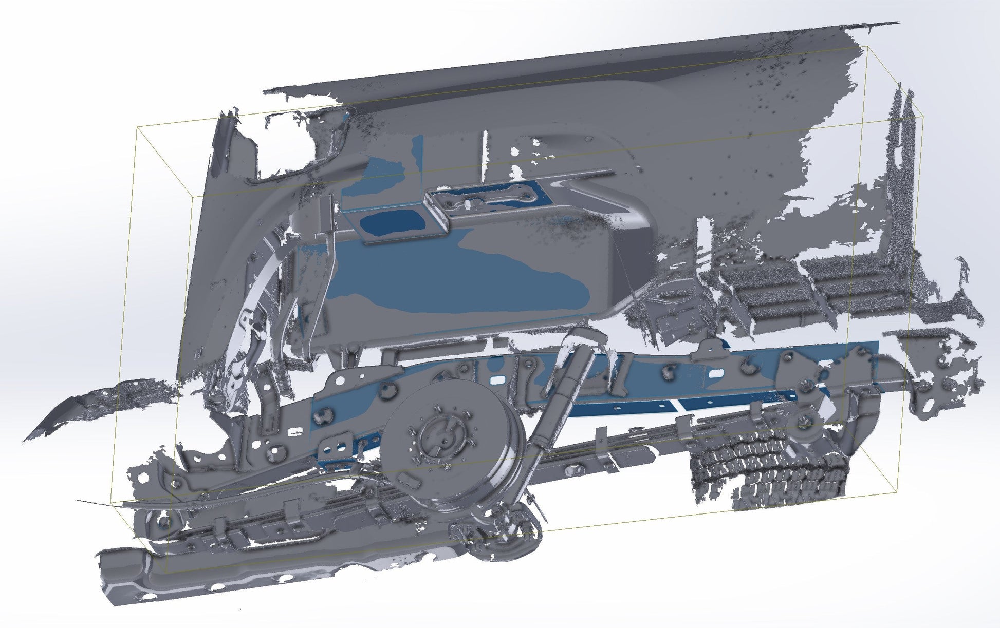 3D scan file of outer rear axle, leaf springs, driver chassis frame rail, and partial fuel tank. Accuracy within 1/4" across chassis. Recommended to use OE chassis file when designing high tolerance components.
