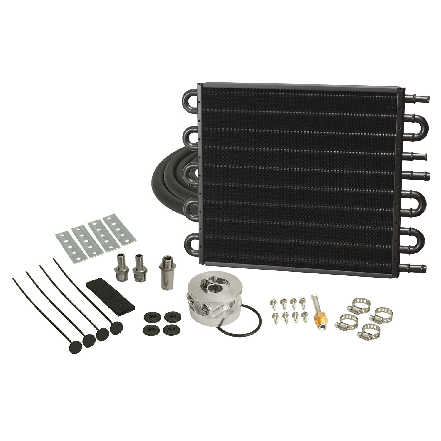 Featuring a free-flowing 4 & 6 pass cooler in one compact package and fabricated of 1/2" copper tubing and aluminum cooling fins, this Made-in-the-USA Dual-circuit cooler includes 2 each 11/32" and 2 each 1/2" barb inlets. It provides heat transfer capabilities for engine and transmission and kit also comes with a large diameter thermostatic sandwich adapter, cooler mounting rods, insta-dapt radiator adapter, hose clamps and 13/16-16 engine thread size to accommodate most GM small and big block V8 models. Made in the USA.