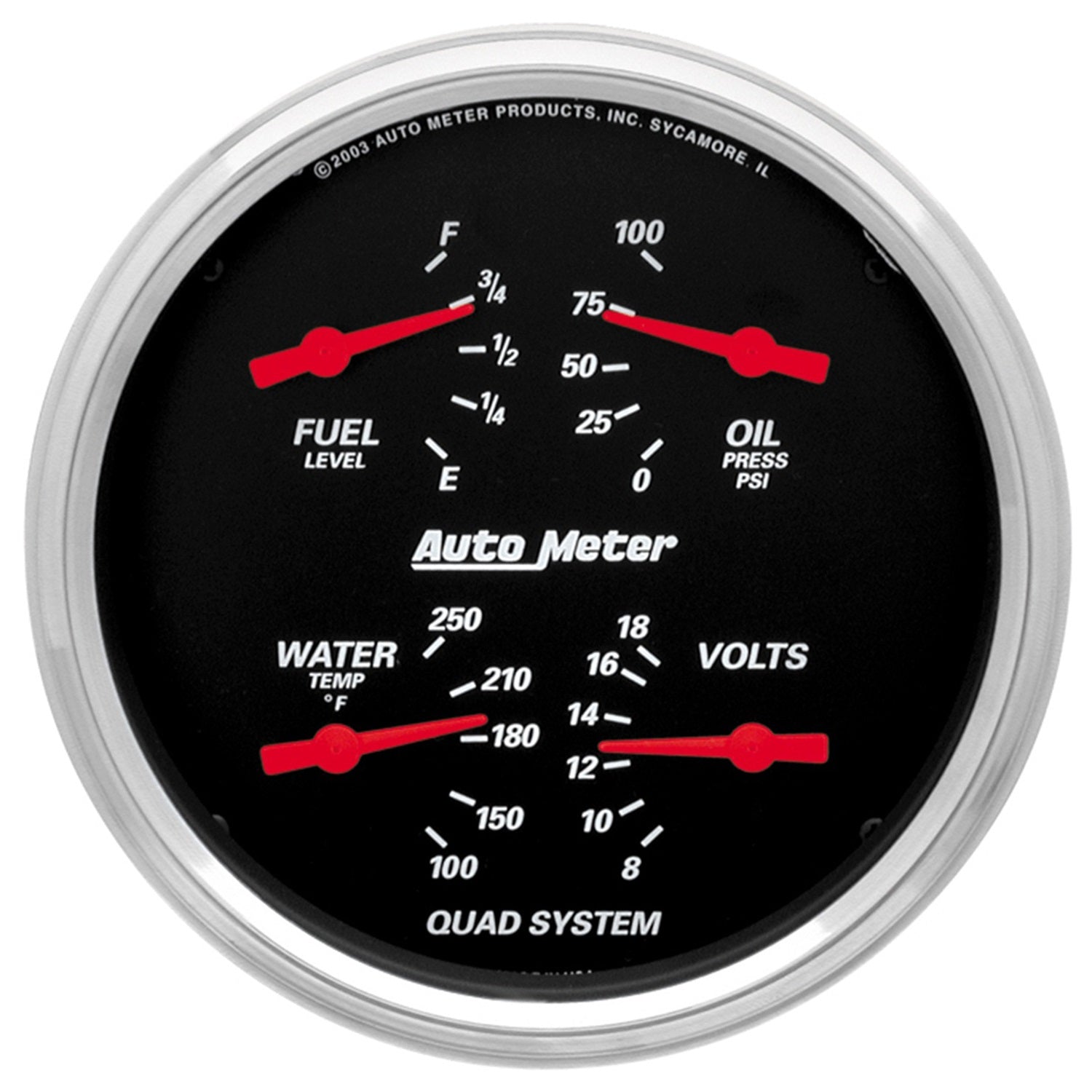 Sometimes Space Is Limited. The Autometer Quad Gauge Provides A Solution To Limited Dashboard Space While Providing A Clean Look. Individual Autometer Air Core Meter Movements For Each Function Provide The Accuracy And Durability Required By Even The Most Demanding Applications. Includes A Single Wire 1/8" Npt Temperature Sender And A 1/8" Npt Oil Pressure Sender. The Voltmeter Reads From 8-18V On Negative Ground Electrical Systems And Fuel Level Resistance Range Is 240 Ohms Empty To 33 Ohms Full (Compatible With Autometers 3262 Fuel Level Sender).