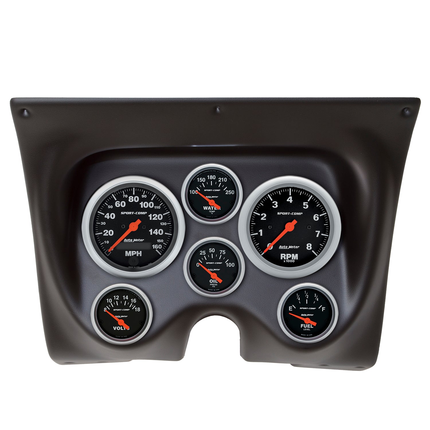 - Includes 3-3/8" Sport Comp electric speedometer & tachometer and 2-1/16" electric fuel level (0/90 ohm), water temperature, oil pressure, and voltmeter