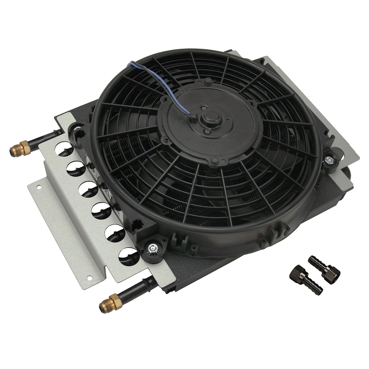 With its own air supply available when needed, this Electra-Cool is one of our most popular remote coolers and can literally be mounted anywhere space permits, making it a popular addition for performance compacts, hot rods, muscle cars and trucks. An efficient 8-pass tube and fin cooler coupled with a powerful 10" diameter Tornado fan and aluminum brackets, and featuring -6AN male fittings, each unit also includes 2 each -6AN x 3/8" barb fittings. Designed for transmission, power steering and fuel cooling.