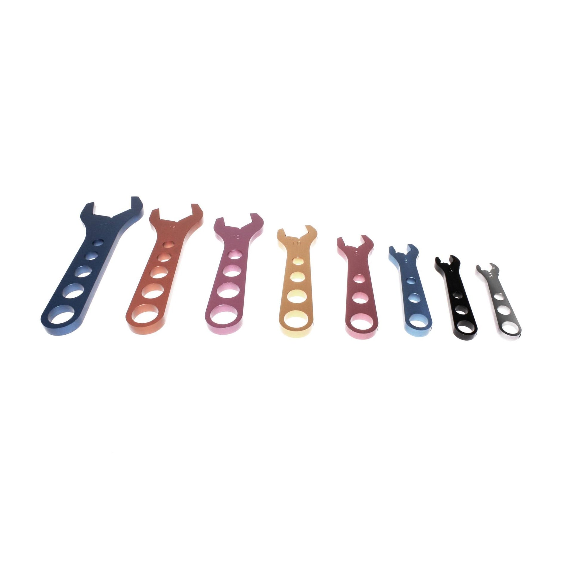 These wrenches are made specifically to tighten all those expensive AN fittings. Precision machined of 6061 T6 aluminum. Sized and relieved in the corners. Engineered to be a perfect fit, so won?t mar your fittings. Compact design handles help prevent over-tightening. Color code anodized & size stamped for easy identification.