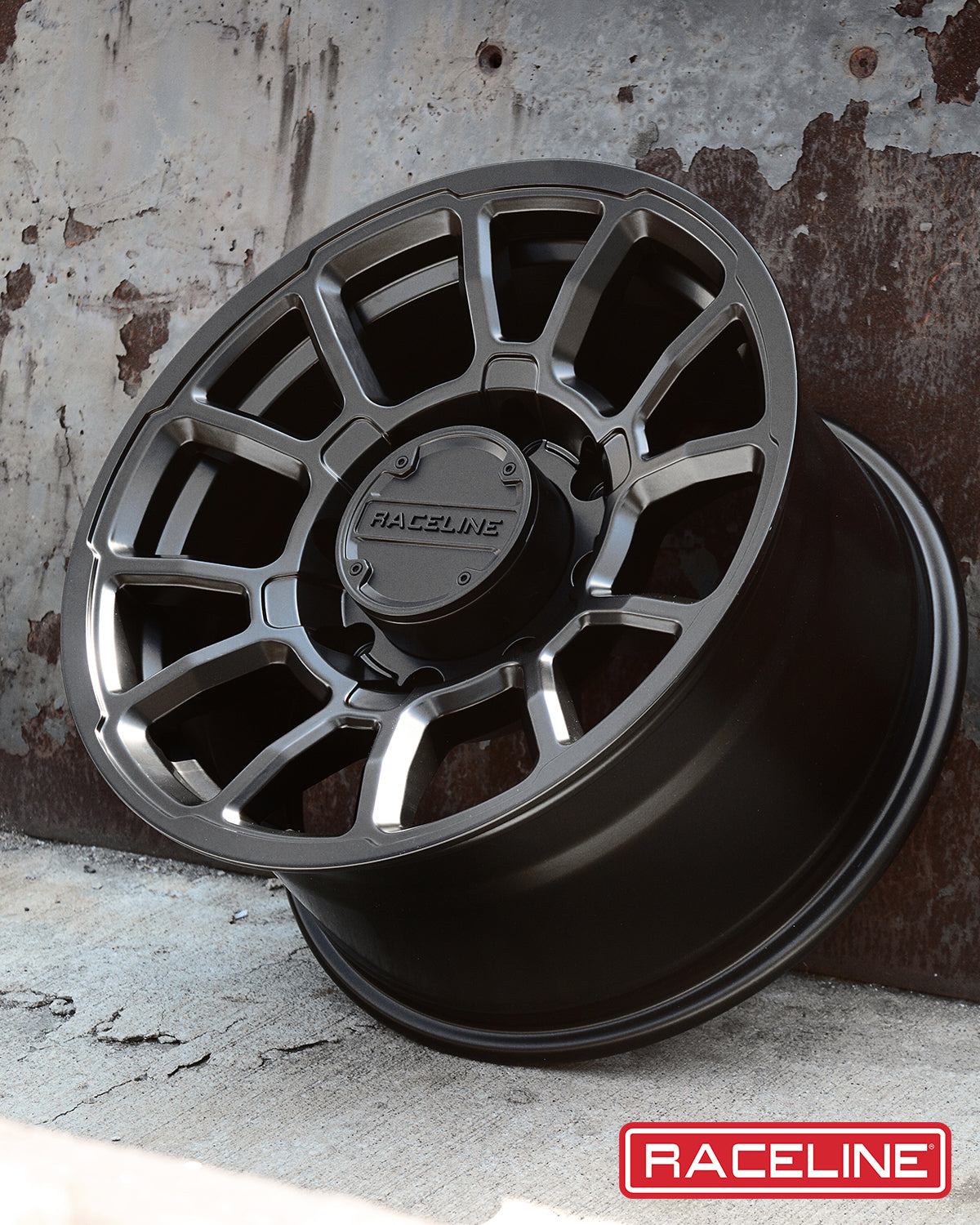 • Black Out snap in cap with contrasting embossed Raceline logo Push thru cap for 8 lug applications