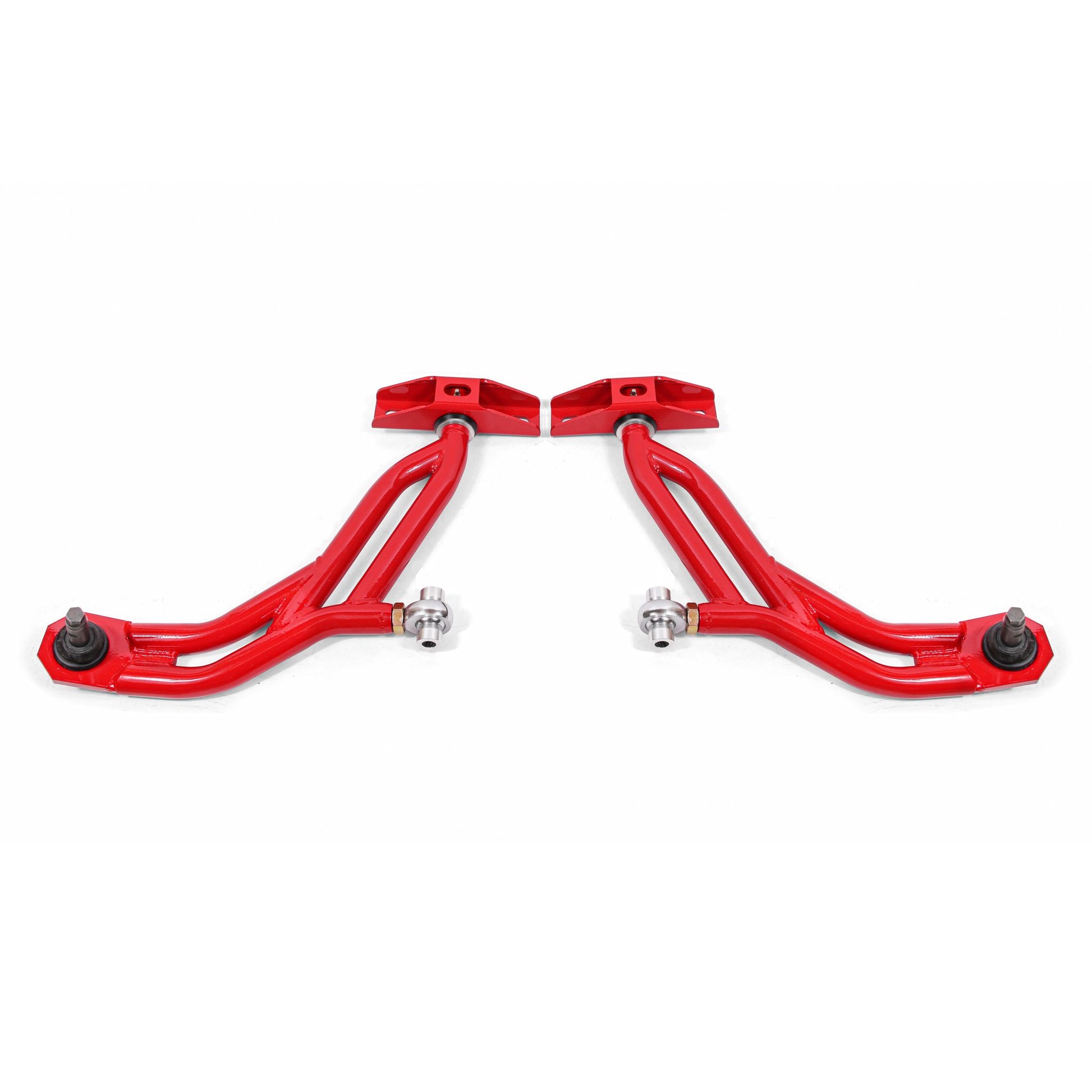 A-arms are one of the most important, yet overlooked suspension components. They are the direct link between the front wheels and the chassis. Any deflection causes a change in alignment, which results in poor performance and driving feel. Fabricated from heavy-duty 1.25-inch, 0.120-inch wall DOM tubing, deflection is eliminated with A-arms from BMR Suspension. BMR?s AA757 Lower A-arms are equipped with greasable heavy-duty ball joints, greasable Delrin bushings (rear mount) to handle the high loads, and zinc-plated, X-series, heat-treated, chrome-moly, self-lubricating, Teflon-lined rod ends for loads of adjustability. Solid mounts give you a more responsive feel over the stock rubber bushings. BMR?s bushings allow grease to evenly coat the inner sleeve. This efficient lubrication ensures quiet, reliable operation over the life of the bushings. The combination of rod ends and Delrin bushings gives you improved steering feel and responsiveness for any for of driving. Based on our well proven traditional A-arm design, these Handling A-arms feature ?-inch taller ball joints to raise the roll center height on lowered vehicles for improved handling.