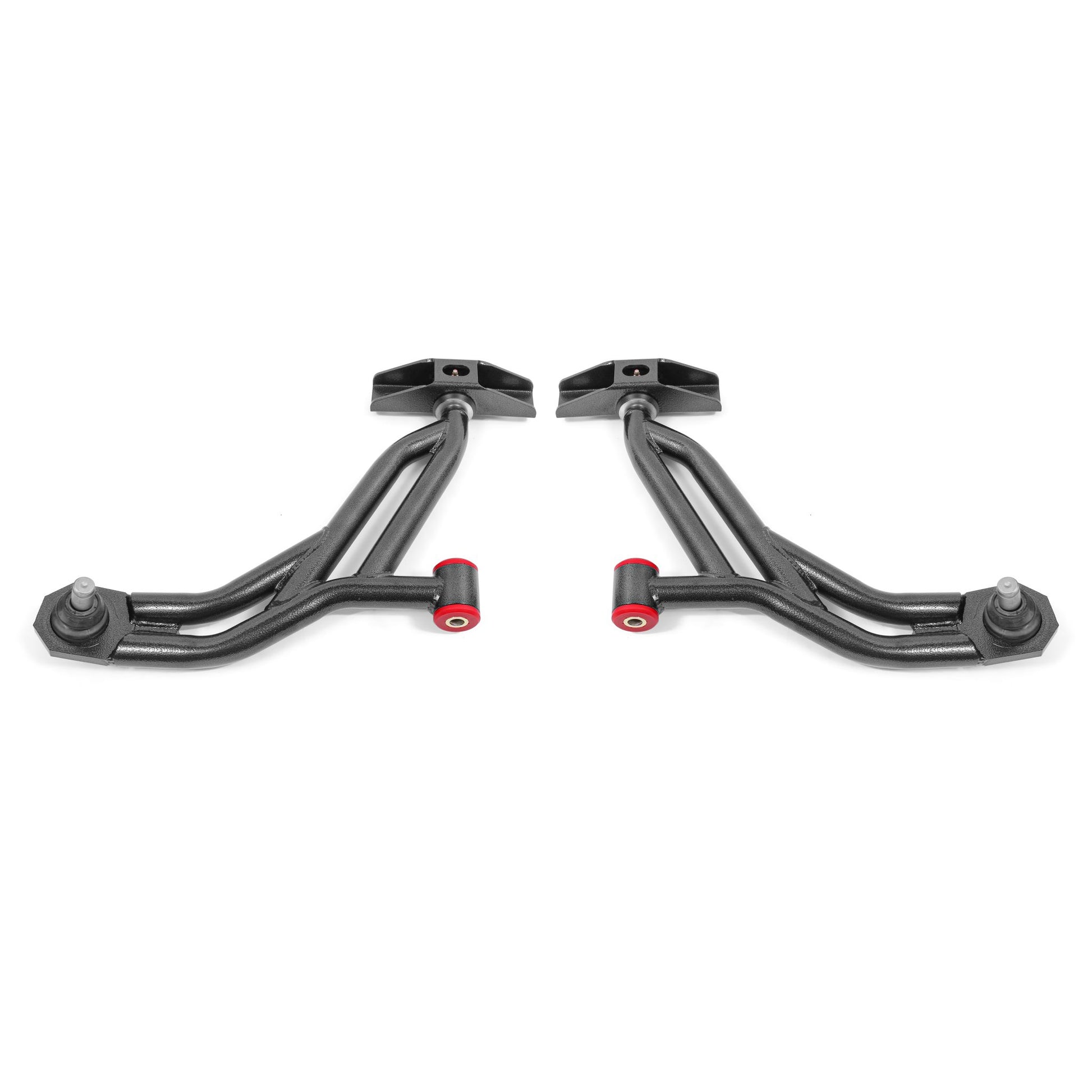 A-arms are one of the most important, yet overlooked suspension components. They are the direct link between the front wheels and the chassis. Any deflection causes a change in alignment, which results in poor performance and driving feel. Fabricated from heavy-duty 1.25-inch, 0.120-inch wall DOM tubing, deflection is eliminated with A-arms from BMR Suspension. BMR?s AA754 Lower A-arms are equipped with greasable heavy-duty ball joints, 95-durometer polyurethane bushings (front mount), and greasable Delrin bushings (rear mount) to handle the high loads. Polyurethane bushings add a solid, more responsive feel over the stock rubber bushings. BMR?s bushings are internally fluted, which allows grease to evenly coat the inner sleeve. These flutes also direct grease to the outer edge of the bushing, keeping the thrust surface lubricated. This efficient lubrication ensures quiet, reliable operation over the life of the bushings. The combination of poly and Delrin bushings gives you improved steering feel and responsiveness for any type of driving.
