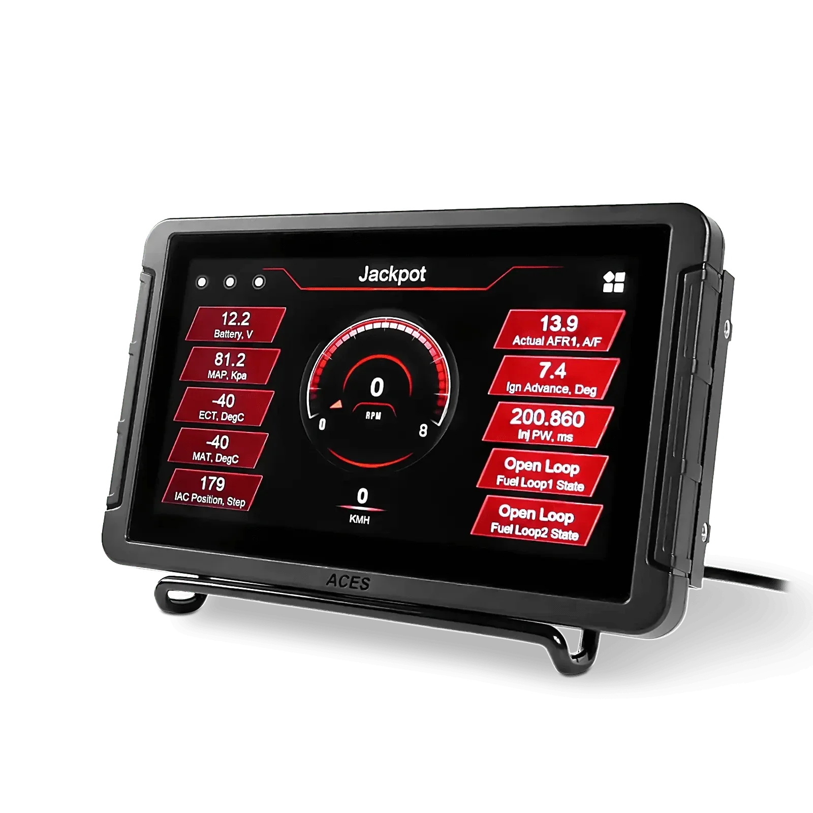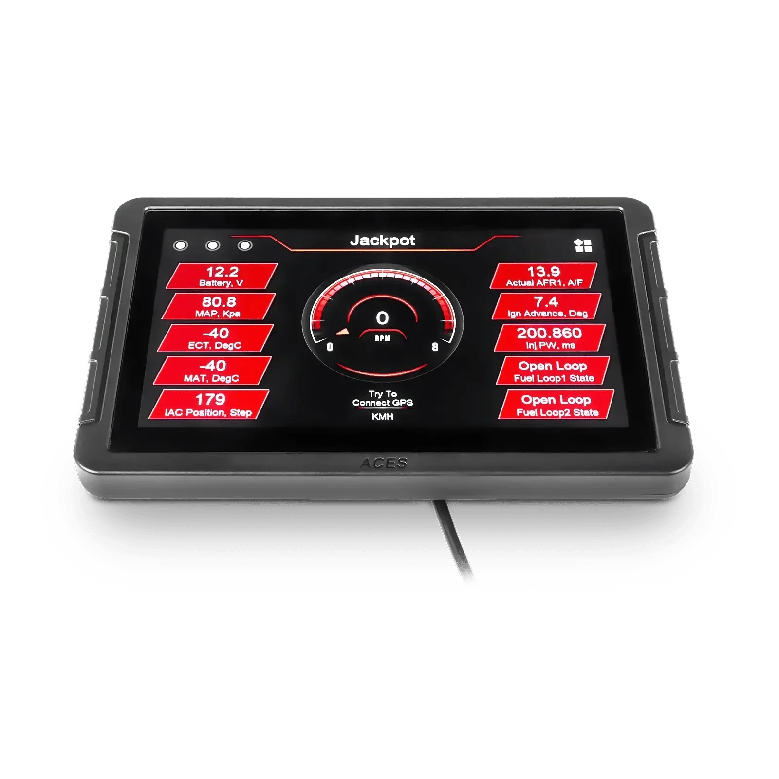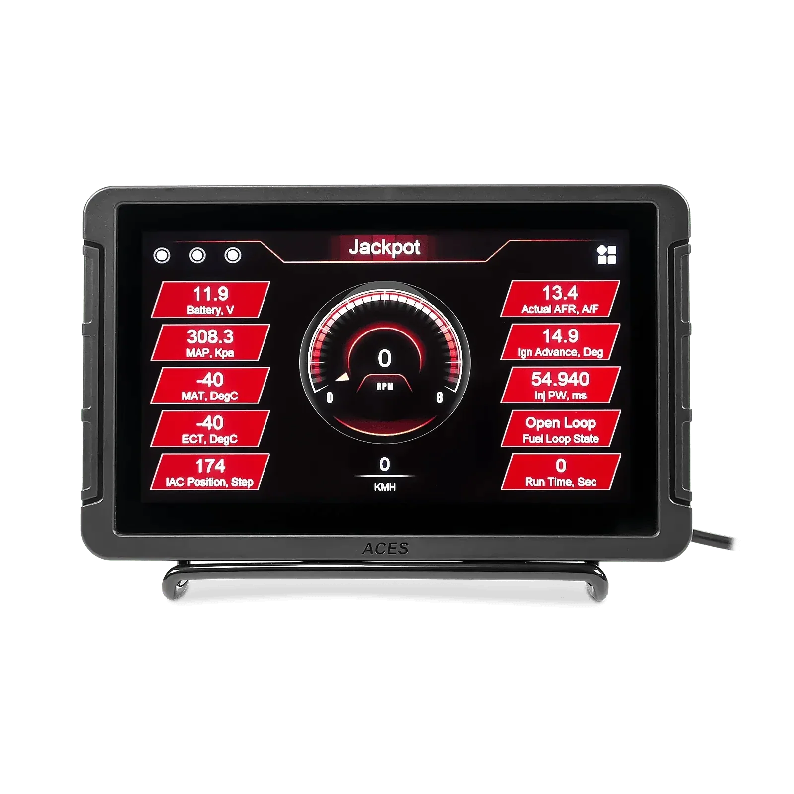 The ACES 7" Handheld is designed for handheld and dash applications. It features a 7" 1024x600 resolution low glare, high brightness, high contrast, full-color capacitive touch screen for easy viewing even in the sun, plug and play connection to all ACES EFI systems.