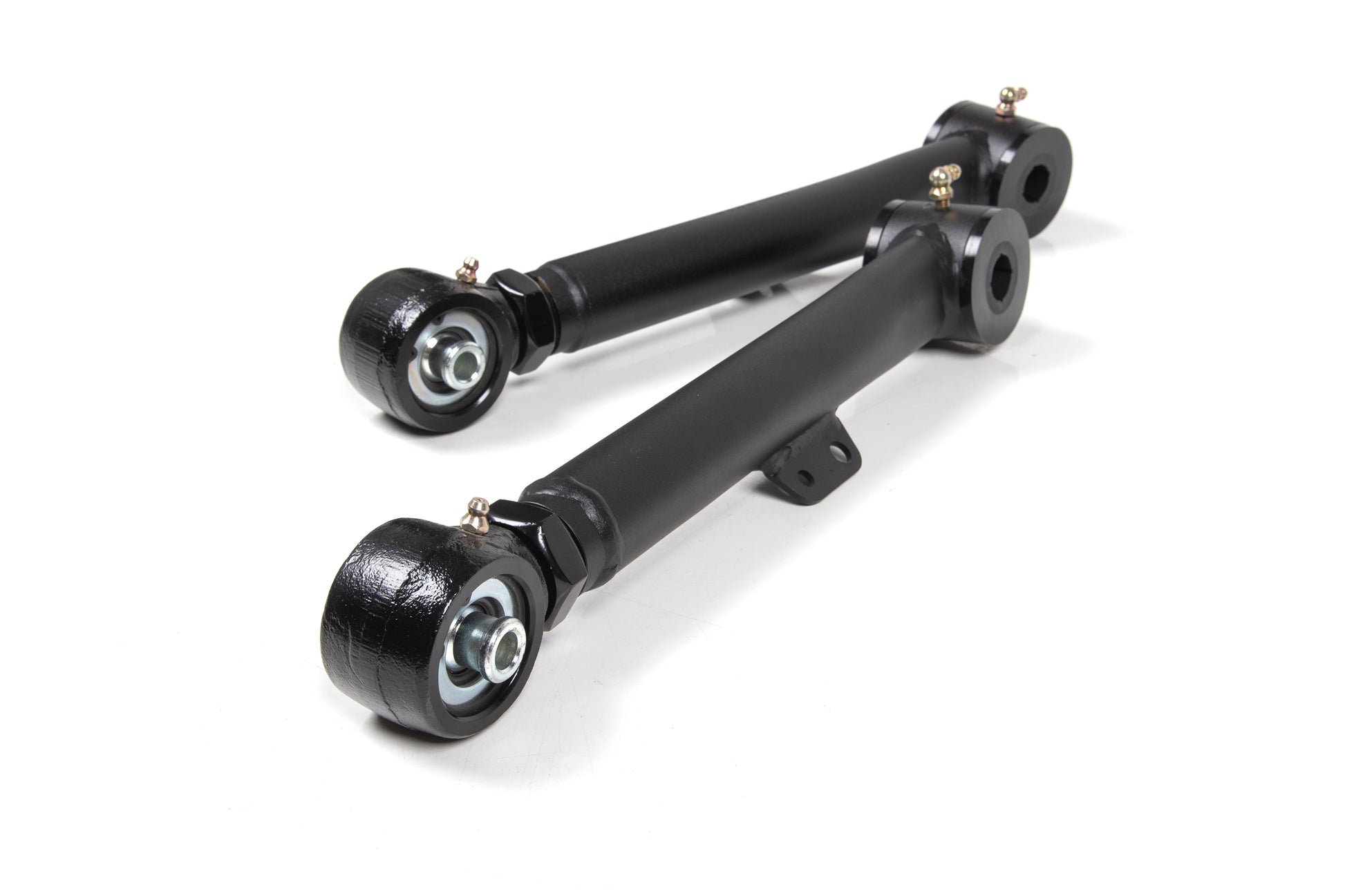 At the axle end they utilize an OE-style poly bushing for long service-free operation and better isolation of noise vibration and harshness (NVH). At the frame mount they feature a large forged flex end for strength durability and off-road articulation. The forged flex ends allow length adjustments to correctly position the rear axle and correct caster. Capable of 15-degrees of misalignment in either direction for more flex out on the trail.