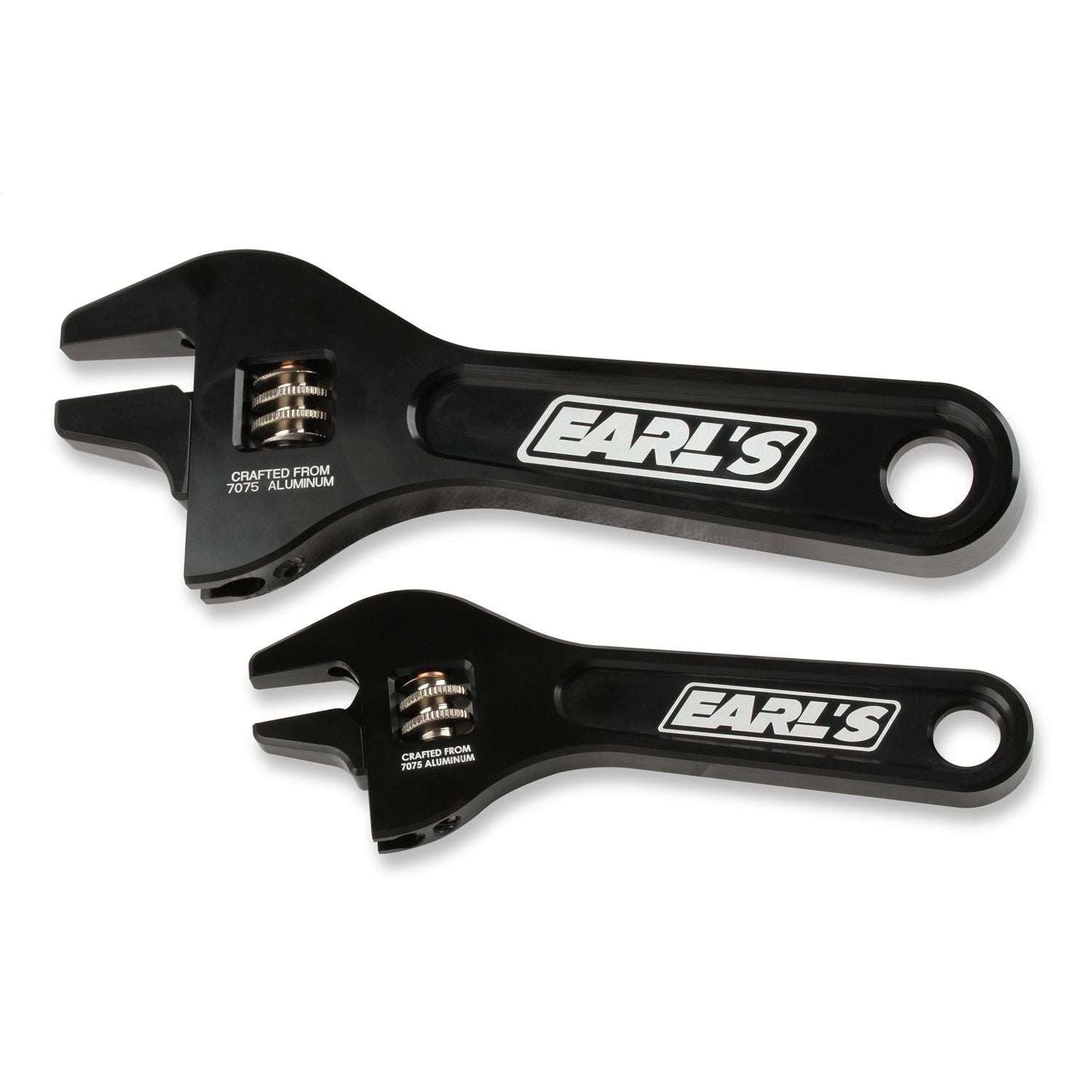 Tired of having to run to your toolbox multiple times to get the proper AN wrench? Earl's has engineered a solution! The new Earl's 2 pieces adjustable AN wrench set. These wrenches are CNC machined from true aerospace grade 7075 billet aluminum and feature a precision mechanism with a Steel Nickel knurled thumbwheel. The handles have chamfered edges that fit comfortably in your hand. Quick size adjustment make it ideal for use in the pit area, staging lanes, or back at the shop. The Mini Wrench Fits AN -3 to -8 & the Standard Wrench fits AN -3 to -12.