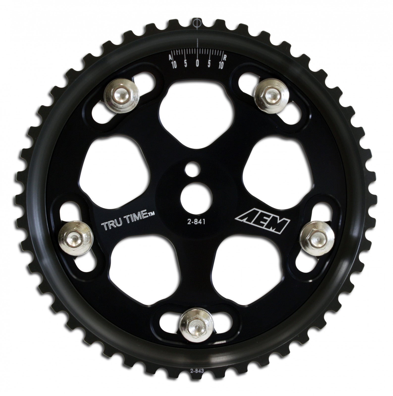 AEM Tru-Time Adjustable Adjustable Cam Gears are available in a multi-spoke, five-bolt designs.