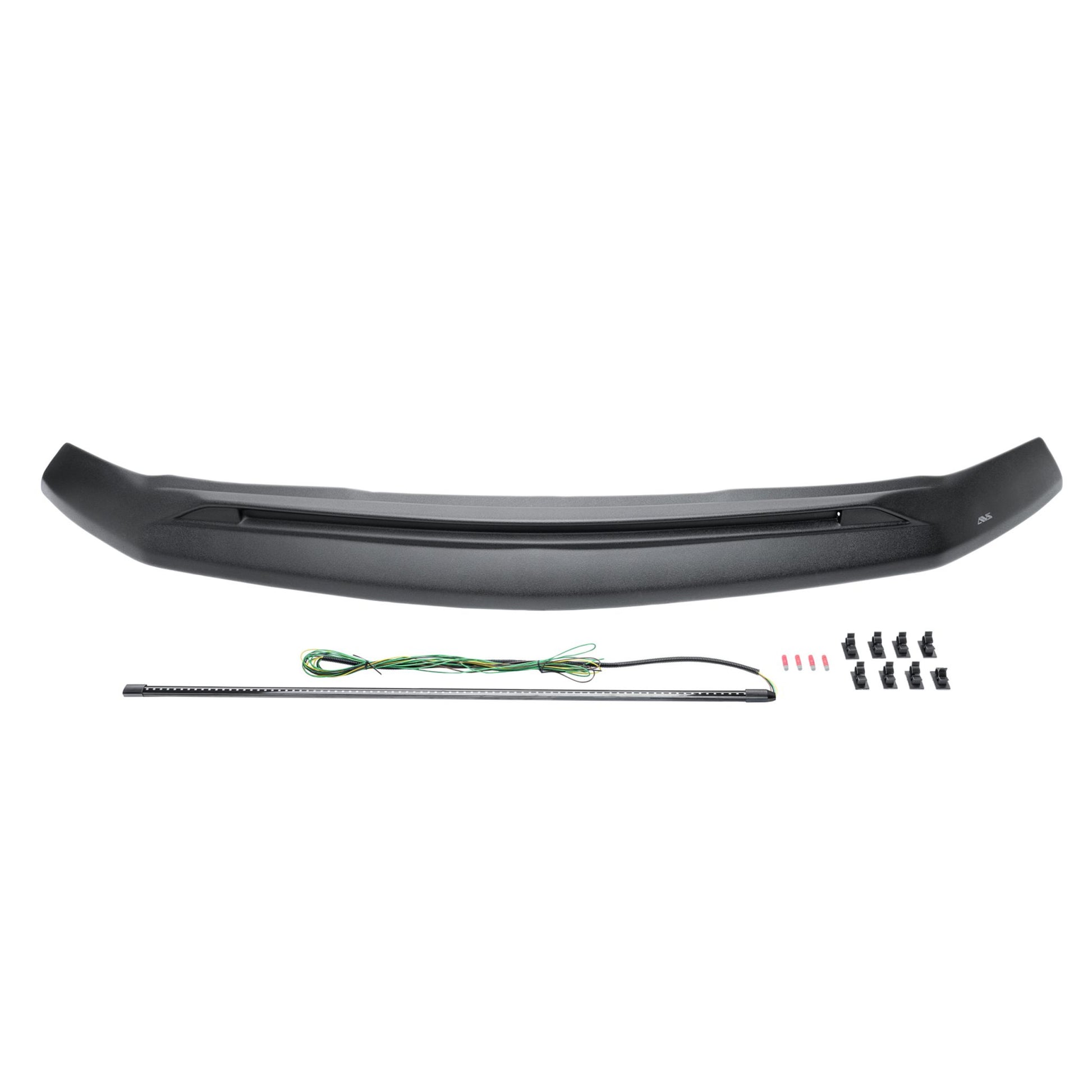 Road warriors, overlanders, and daily drivers unite! AVS has made it easier than ever to light up the trail or illuminate the night with their Aeroskin LightShield Pro. It's the rst hood shield featuring fully integrated amber LED running lamps with multiple light output sequences for added ash and function. Its curved, aerodynamic design creates a powerful upstream of air that sweeps bugs, dirt, and road debris up and away from your vehicle, leaving your hood looking showroom- oor-new. The single-piece construction uses UV-resistant Dura-Flex 2000 TPO material, so it bends without breaking, exes without cracking, and never discolors from the sun. The 3M automotive-grade adhesive makes installation fast and easy -- no tools or special hardware required. Available in a textured matte black nish. Proudly made in the USA with global materials.