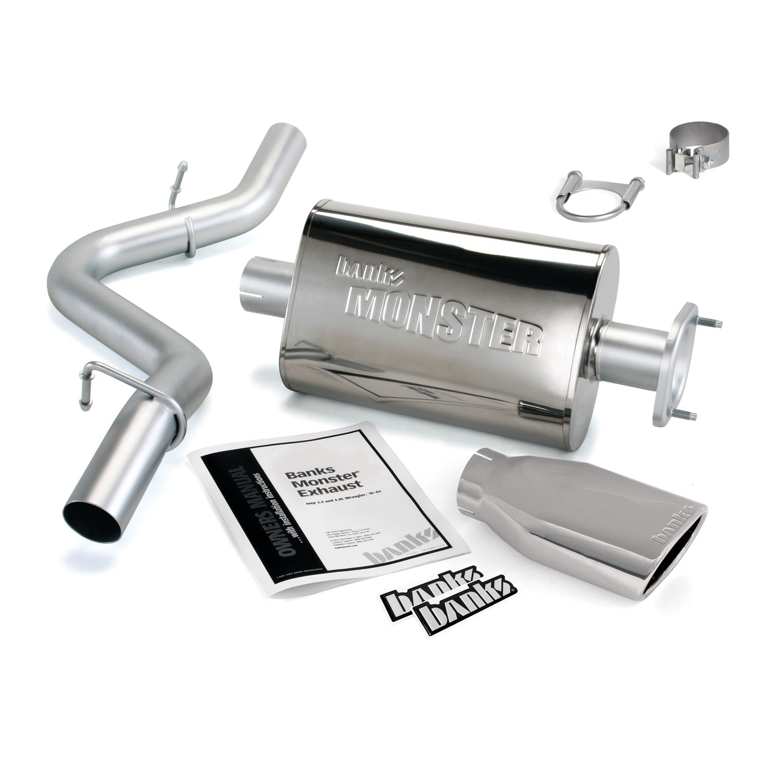 Huge 2.5 inch stainless mandrel-bent tailpipe with a polished or Black tip. Straight-thru Monster muffler flows up to 140 percent better than stock. Slashes backpressure; throaty sound. Constructed of heavy-gauge stainless steel, Banks Monster features a supersized, 2.5 inch tailpipe with a stainless tailpipe tip polished to a mirror finish. Banks Monster muffler, its straight-through performance muffler, is the industry's least restrictive. In comparison tests, Banks muffler flowed 501.2 cfm at 1 psi - a 140 percent improvement over the stock exhaust's 208.6 cfm, and about 44 percent better than the nearest competitor. Monster virtually eliminates backpressure from the catalytic converter back, for more power and efficiency - and an authoritative, yet civil, exhaust note. For maximum results, combine with Banks TorqueTube system. Includes: Stainless Monster muffler; Stainless 2.5 inch tailpipe; Stainless tailpipe tip in polished Chrome or black; Mounting hardware.