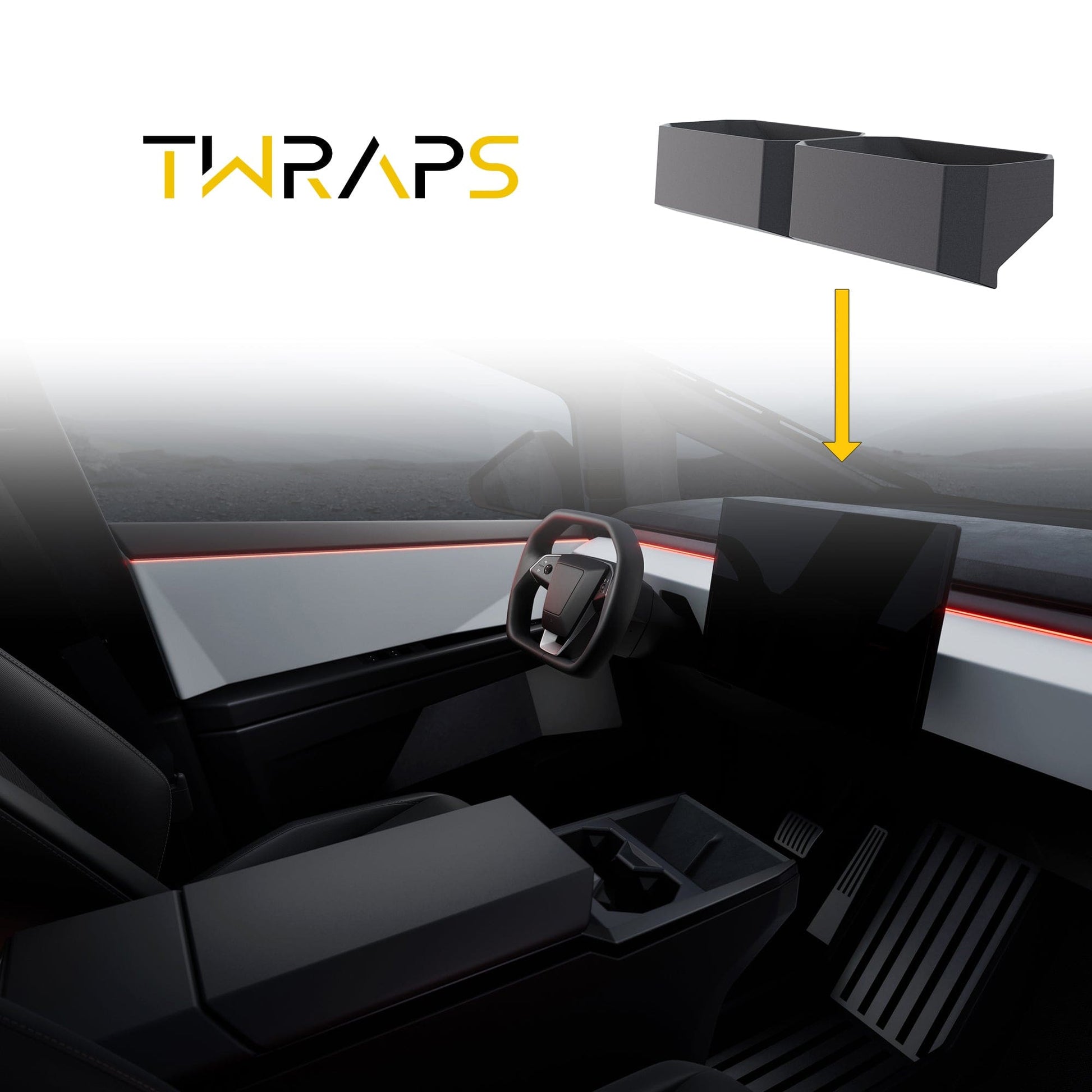 Transform the Tesla Cybertruck's interior with the TWRAPS sleek behind-the-screen storage organizer. Crafted from durable ABS and lined with premium faux leather, it offers a noise-free, secure space for essentials without adhesives. Double your storage by adding a second unit, keeping items like sunglasses and devices within easy reach, enhancing both style and functionality in your Tesla.