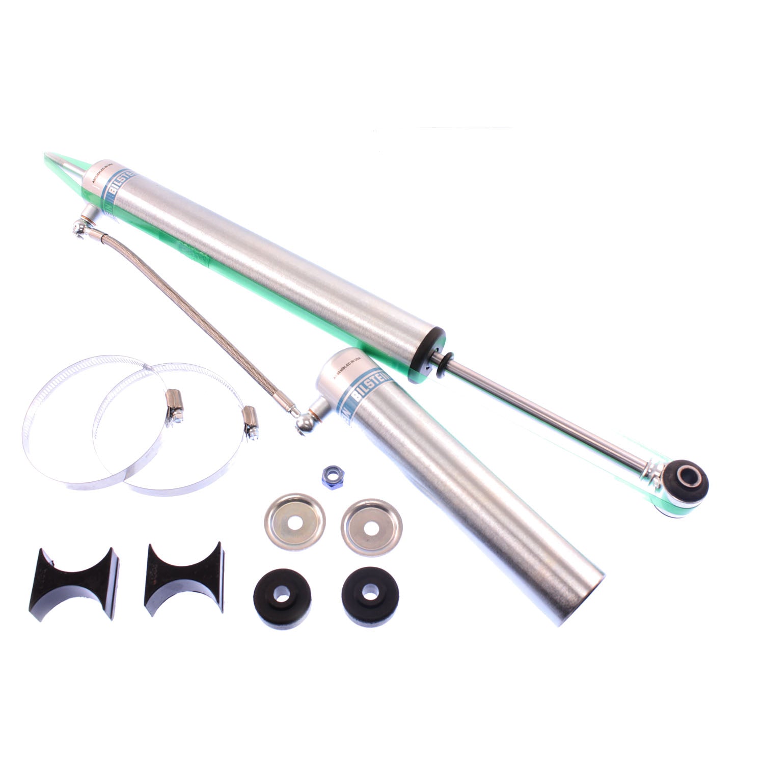 Bilstein B8 5160 remote reservoir shock absorbers are designed as a direct fit solution for lifted trucks and SUV’s. The remote reservoir will offer increased cooling capacity and wheel travel to optimize overall performance compared to a traditional shock absorber. These shock absorbers feature a monotube design for consistent fade free performance and utilize velocity sensitive digressive valve settings which are tuned for each specific application. Each shock absorber is fitted with a unique 360 degree swivel banjo hose fitting, providing a clean, low profile installation. B8 5160 remote reservoir shock absorbers will increase overall durability of your vehicle allowing you to conquer the harshest of off-road environments.