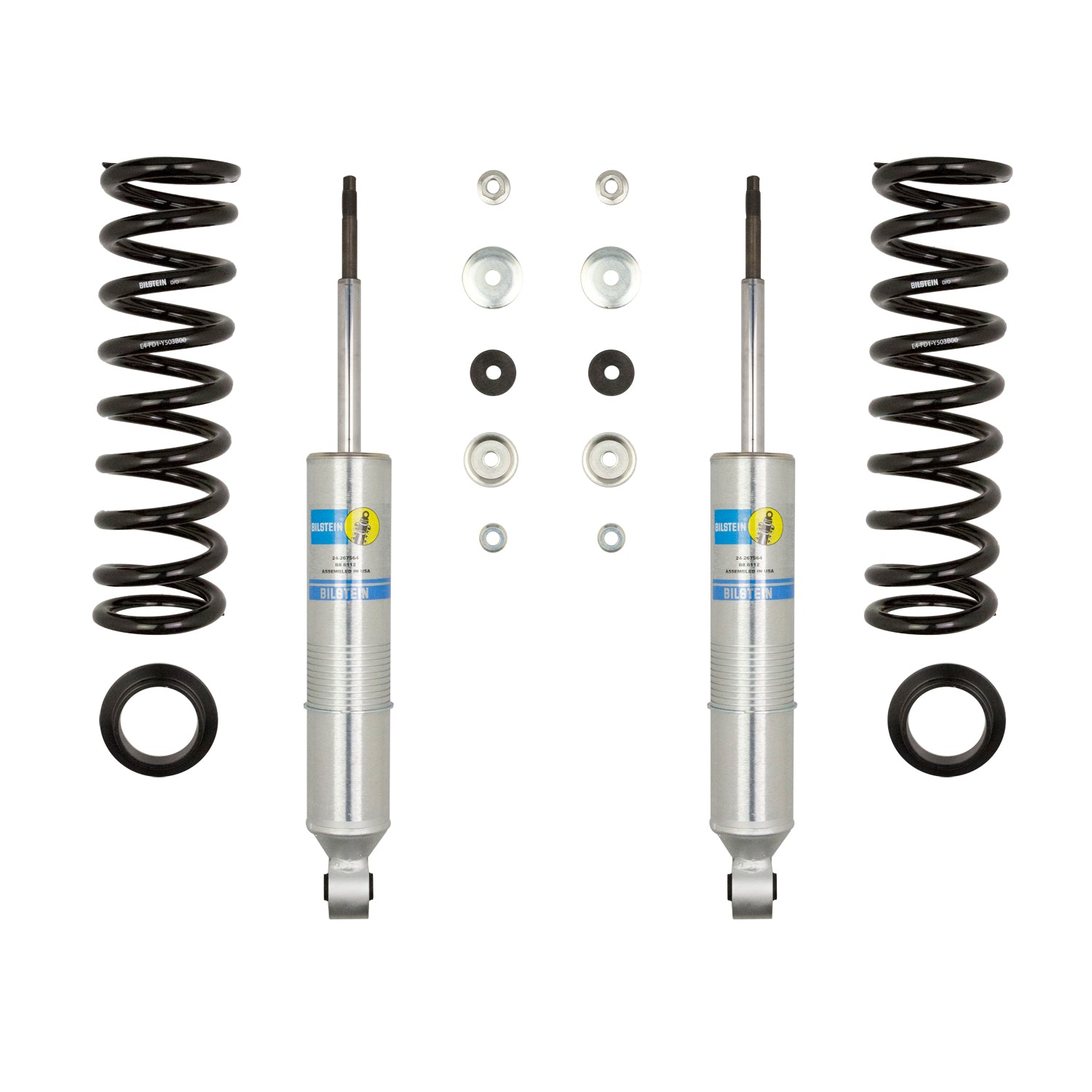 Bilstein B8 6112 leveling kits are designed to provide more ground clearance, allow for larger tires, and increase wheel travel. Multiple snap-ring grooves in the body allow for different spring seat positions, providing 0-2.75 inches of front lift (depending on application). These kits consist of (2) 60mm shock absorbers combined with (2) custom matched cold wound coil springs and (2) billet aluminum spring seats. The large 60mm digressive piston allows for increased damping control for optimal on-road and off-road capabilities. Experience the legendary Bilstein off-road experience with the best direct fit spring and shock kit for your light truck or SUV.