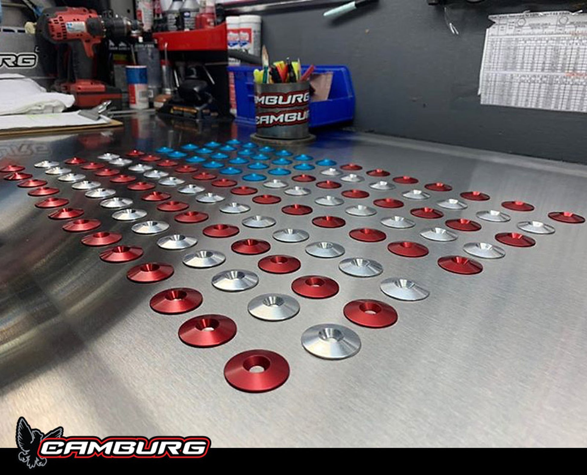 These fender washers are great for mounting fiberglass fenders, aluminum panels, etc. as it spreads the load over a greater surface area. They are CNC machined in-house from domestic 1.25" OD 6061-T6 aluminum and are available natural or anodized black, gold, red or King blue. They are designed to be used with a 1/4" flat head screw with a 82 degree taper under the head. We've been supplying these to the offroad industry for 20+ years. These aren't cheap imports or copies like you'll see online. We also offer a 10pk kit that includes the stainless screws and weld-on tabs.