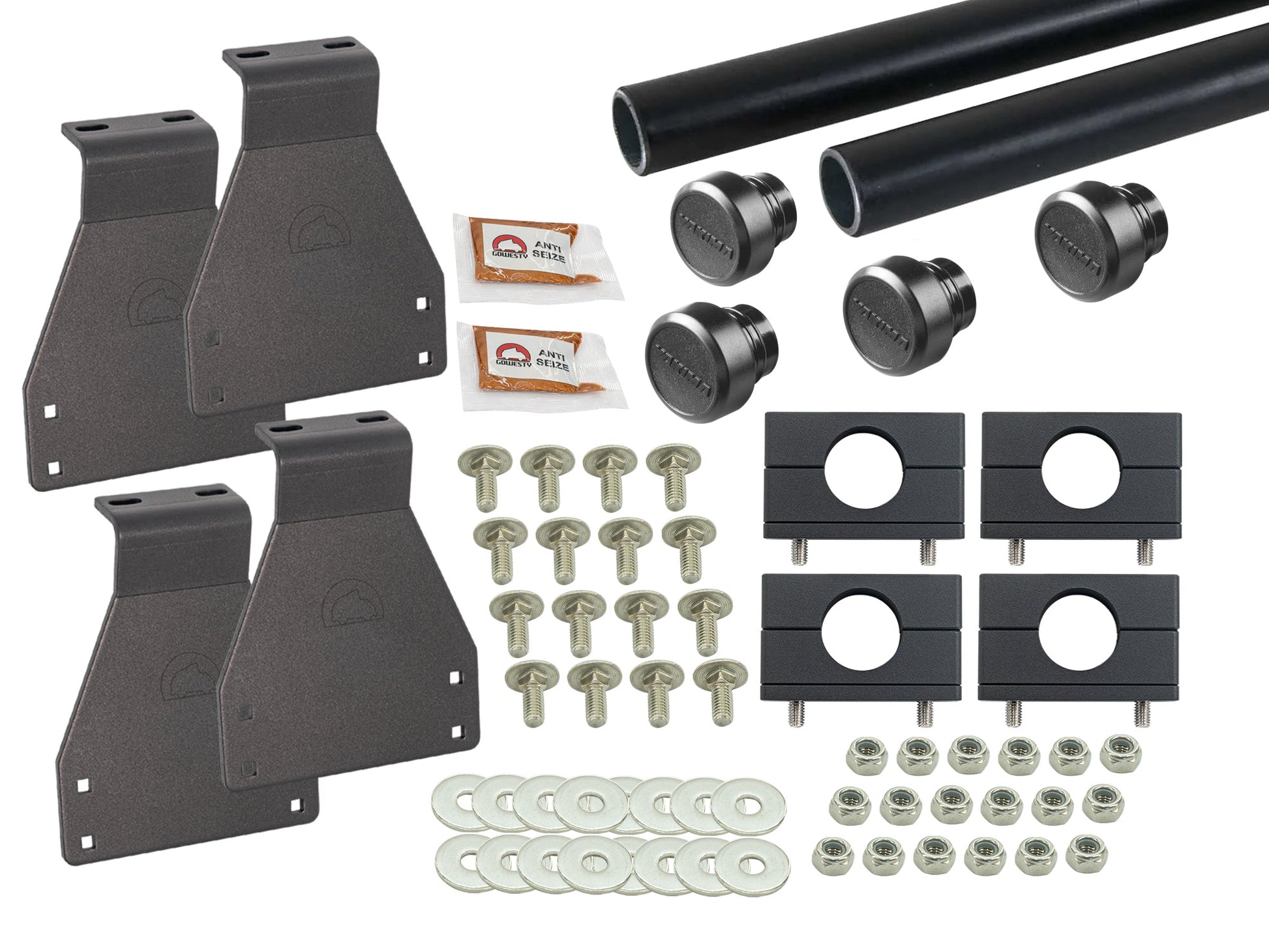 Kit details: Coated in a textured black powder coat, each pair of stainless brackets includes stainless hardware to mount them to your fiberglass pop-top. The top of the main bracket sits 1.5" from the top of your van. 78" Yakima Crossbars, and mounting U-bolts or billet clamps complete the offering. To mount square Thule bars, you'll need to get your own appropriately sized square U-bolts.