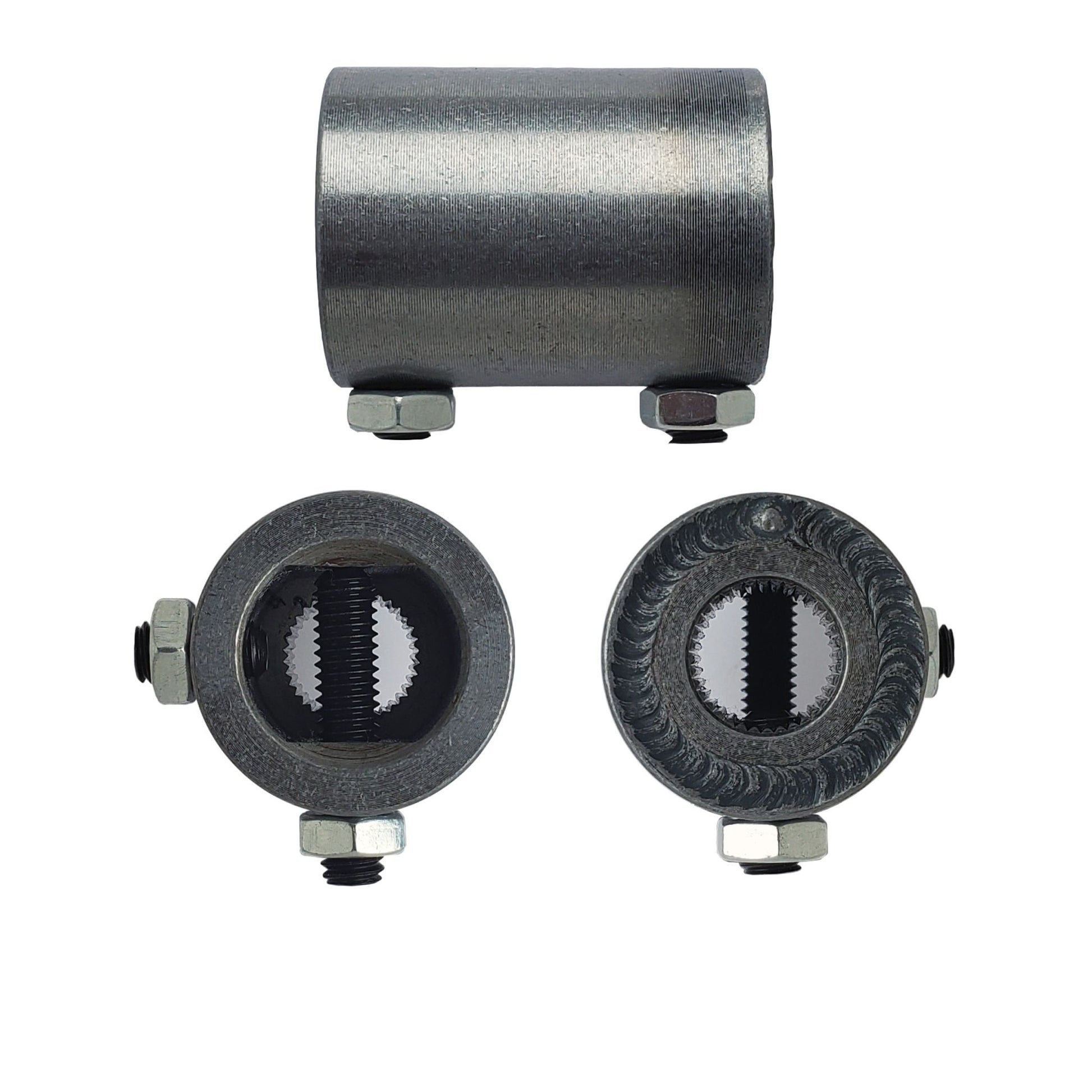 Using a 2" straight extension, called a coupler, to extend the steering box, R&P shaft or the column shaft, can sometimes eliminate a universal joint. The coupler can be welded or pinned to the un-splined end of a shaft. The 1"- 48 and 1" DD couplers have a 1-1?4" hole that will accept either an adapter to reduce inside diameter to 3/4" smooth or another splined or 3/4" DD coupler. The coupler assembly would have to be pinned and/or welded together. Welding the coupler is acceptable because there are no moving parts to damage, and the coupler's steel is less susceptible to heat damage from welding. Couplers are available in the same spline and Double D sizes as our universal joints. Couplers and adapters are available in steel and stainless steel only.