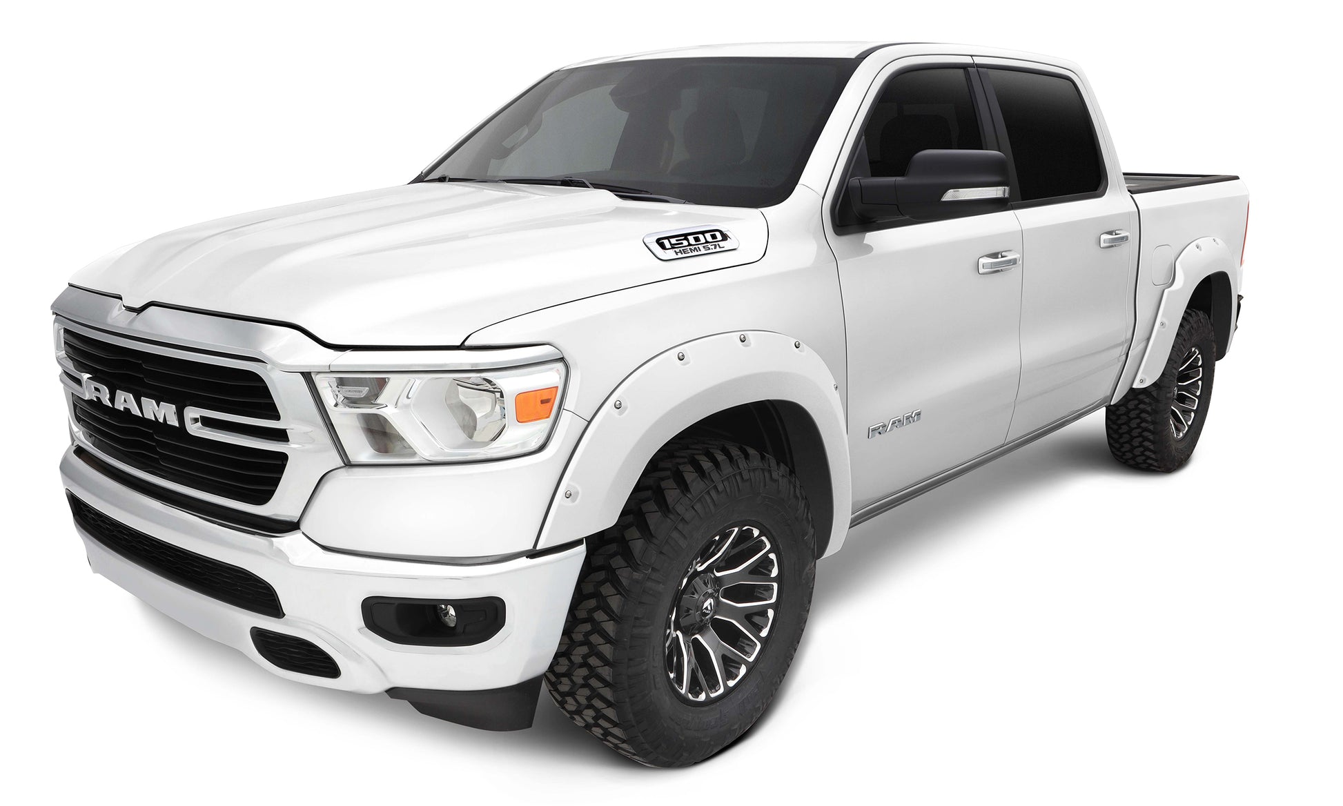 Bushwacker's rugged, iconic Pocket Style Fender Flares allow for more tire coverage and more clearance for trucks and SUVs while protecting the vehicle from dirt and debris. These flares are now available pre-finished to match the paint on your new Ram, plus they have the edge trim and stainless steel hardware pre-installed for quick and easy installation and a perfect fit . Made from sturdy Dura-Flex 2000 material, these flares are warp-resistant and tailor made for each application. Despite their bolted-on appearance, these flares install easily with minimal drilling for a secure fit. And since they're ready to install out of the box, there's no waiting on paint, and no hassle with installation.