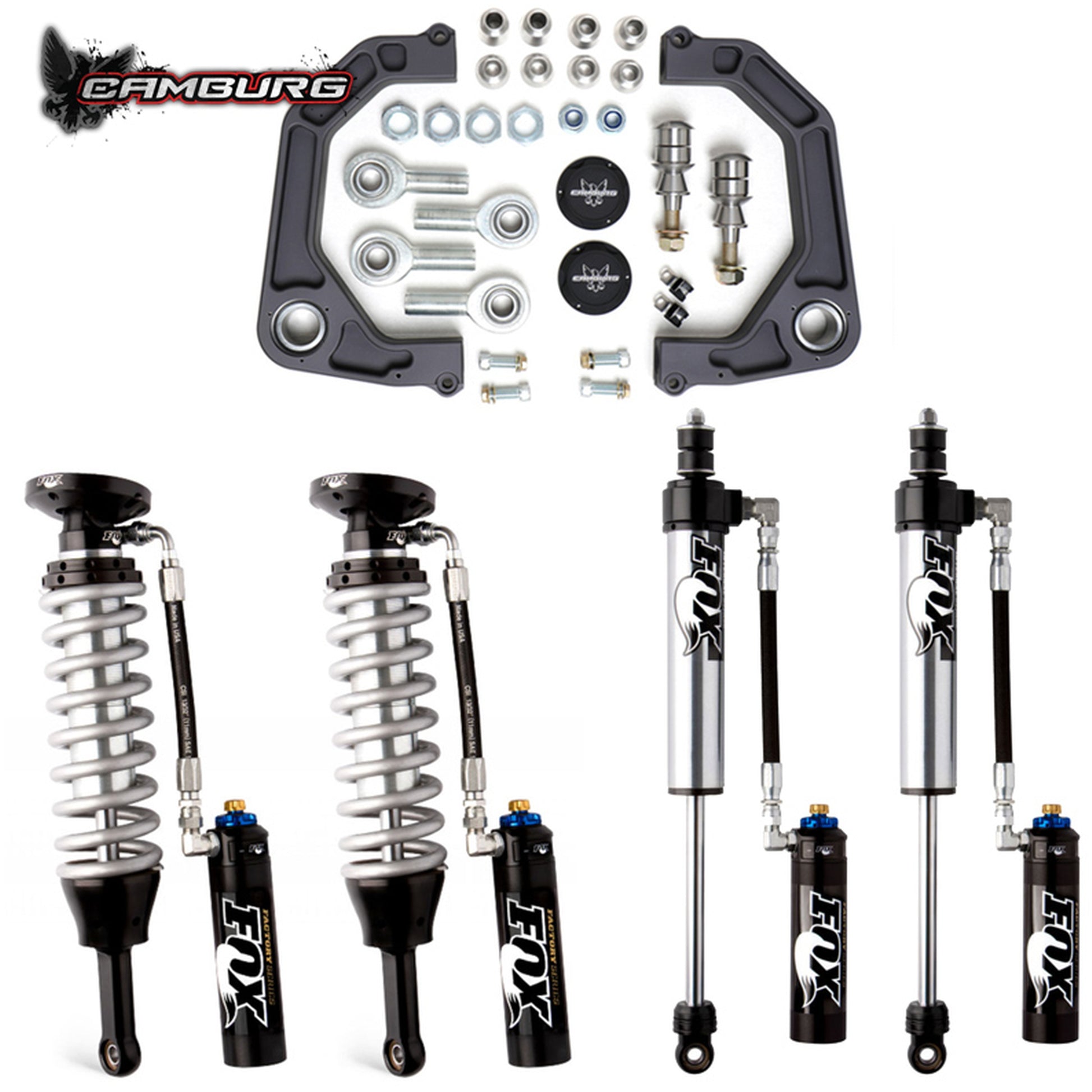 Our FOX 2.5 Factory DSC kit is a high-performance mid travel suspension upgrade for the Toyota Tundra. It includes FOX's 2.5 Factory Series front coilovers with DSC compression adjusters, which offer precise tuning and increased oil capacity for lower operating temperatures. The kit also features remote external reservoirs and Dual Speed Compression (DSC) adjusters, allowing for twelve separate low-speed and ten high-speed compression levels. These components improve ride and handling both on and off-road, increasing wheel travel and correcting suspension geometry. Our upper arms are designed to address the limitations of stock arms after lifting the truck, offering increased wheel travel, improved strength, and better alignment. In the rear, we use FOX's 2.5 Factory Series DSC remote res. shocks, which provide increased oil capacity, control, and damping. These shocks also feature DSC adjusters for precise ride tuning. They increase rear wheel travel and articulation and can be used with stock or Deaver leaf springs. Please note that modifications may be required to eliminate tire rubbing, and certain wheel and tire combinations may not be compatible with this suspension system.