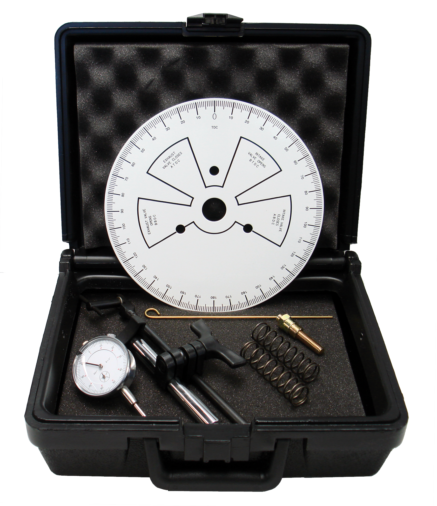 For use with heads on engine. This kit contains all the tools needed to degree cams in the most popular engines, assuring proper cam timing and lobe lift. Features deluxe components including 9" degree wheel, dial indicator, dial indicator mount, 2 valve check springs, clamp kit, 14mm top dead center locator, wire degree wheel pointer, detailed instructions, and a durable foam padded carrying case.