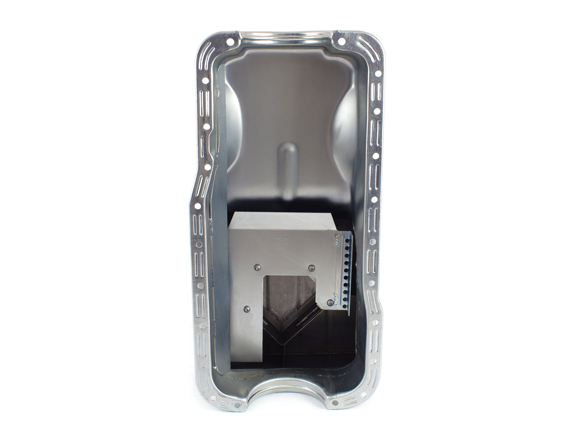 This front sump road race pan is for Ford 289-302. It has a 8 qt. system capacity, 8" deep, 12" wide, 10-1/2" long, 14 ga. sump designed for Cobra kit cars. Will work with stock & aftermarket starters. This pan requires our 15-611 pickup.
